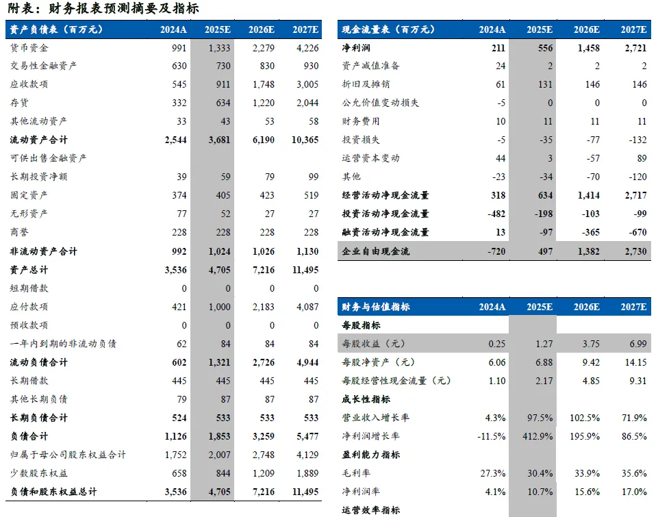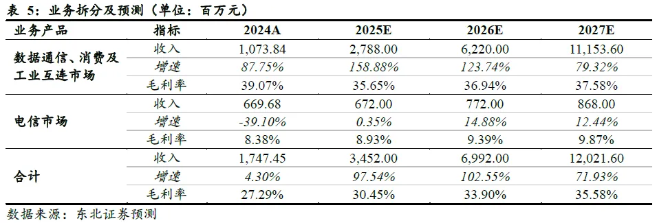 综上所述,公司数据通信、消费及工业互连市场业务未来有望实现高速增长,预计2025-2027年增速为158.88%/123.74%/79.32%,预计毛利率为35.65%/36.94%/37.58%。