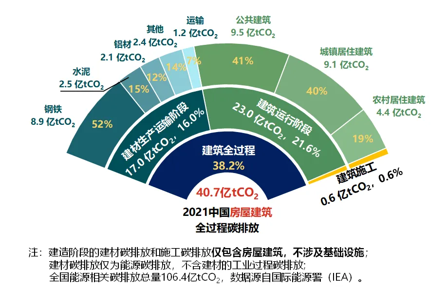 2021年全国房屋建筑全过程碳排放总量为40.7亿tCO2,占全国能源相关碳排放的比重为38.2%。