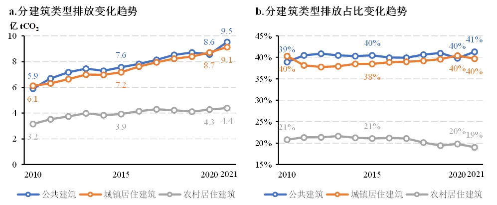 不同类型的建筑的碳排放总量的增速不尽相同,但其占比情况相对固定。总的来看,公共建筑、城镇居住建筑和农村居住建筑的碳排放比重为“4 : 4 : 2”,公共建筑的排放占比在近两年受疫情影响出现波动。