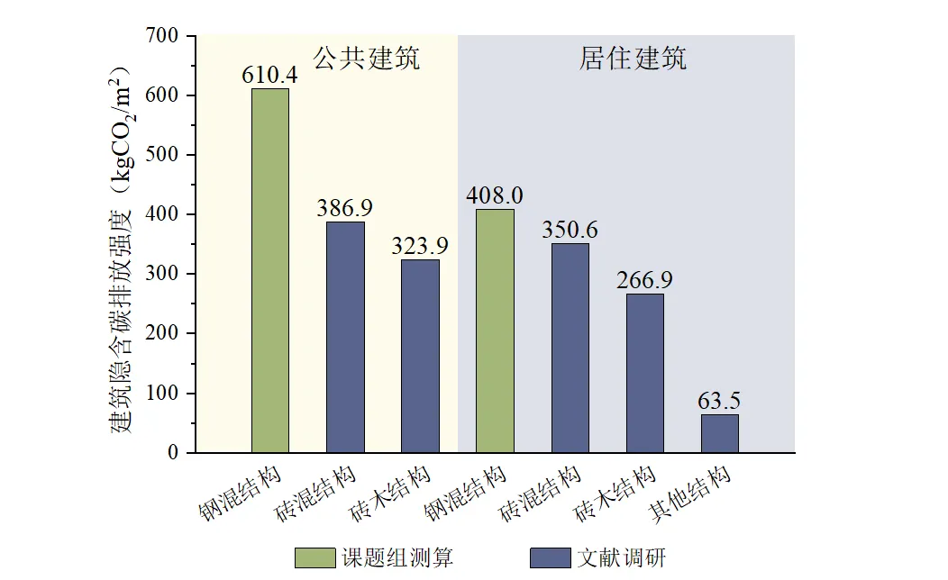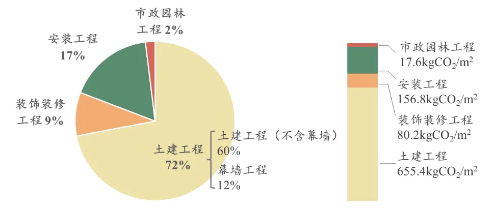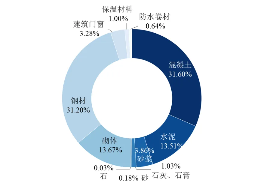 建筑隐含碳主要指建筑建造过程中消耗建材产生的碳排放。根据案例分析,土建工程(其中幕墙工程占比12%)占比为72%,安装工程占比为17%,装饰装修工程占比为9%,市政园林工程占比为2%。根据土建工程的主要建材类别细分,混凝土、钢材、砌体、水泥四类建材占到案例项目隐含碳排放强度的90%。基于大量的样本分析和文献调研,公共建筑隐含碳排放强度总体上高于居住建筑,公共建筑各结构类型隐含碳排放强度高低依次为:钢混结构(610.4 kgCO2/ m2)>砖混结构(386.9 kgCO2/ m2)>砖木结构(323.9 kgCO2/ m2);居住建筑各结构类型隐含碳排放强度高低依次为:钢混结构(408.0 kgCO2/ m2)>砖混结构(350.6 kgCO2/ m2)>砖木结构(266.9 kgCO2/ m2)>其他结构(63.5 kgCO2/ m2)。此外,2021年全国新增建筑面积总量为 33.7 亿m2,建筑隐含碳排放总量为 14.4 亿tCO2 ,平均隐含碳排放强度为 425.7 kgCO2/m2。全国建筑隐含碳排放在2010-2019年间呈现先增长后下降趋势,在2016年达到峰值为15.16亿吨CO2,后在2020年受疫情影响下降,2021年出现回升。