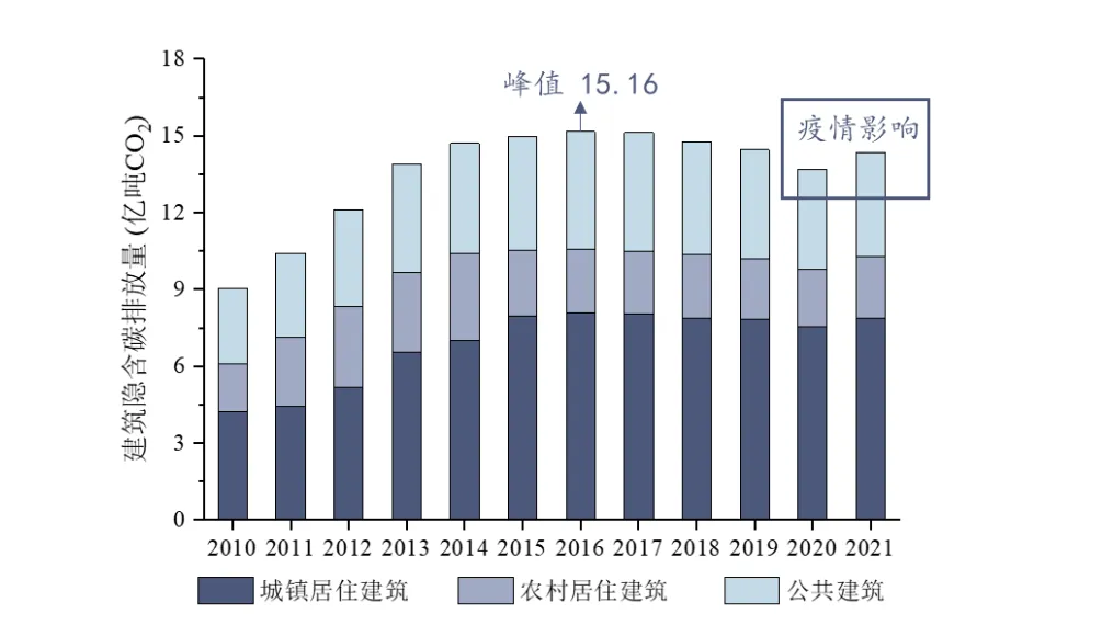 全国建筑隐含碳排放在2016年达峰,后在2020年受疫情影响下降,2021年出现回升。