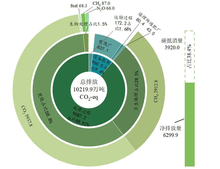 2021年全国城市生活垃圾处理全过程碳排放总量为10219.9万ttCO2-eq。