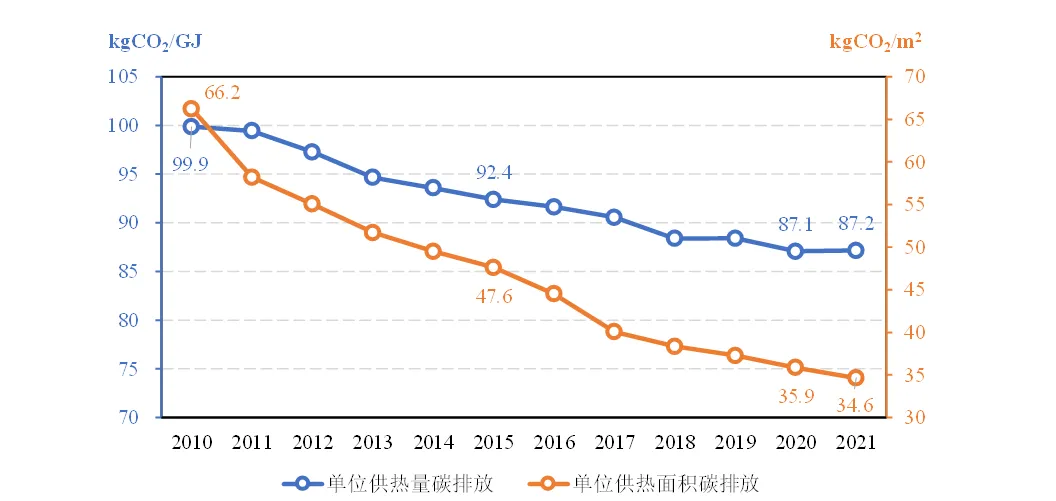 2021年,中国城市建筑集中供热碳排放4.7亿t CO2,同比增长3.3%。2010年以来,我国建筑集中供热碳排放强度持续下降,单位集中供热量碳排放由2010年的99.9 kgCO2/GJ降至2021年的87.2 kgCO2/GJ,降幅为12.7%;单位集中供热面积碳排放由66.2 kgCO2/m2降至34.6 kgCO2/m2,降幅为47.7%。省份和城市之间的碳排放强度存在显著差异,城市级的单位集中供热量碳排放的范围为64 – 155 kg CO2/GJ,已实现100%天然气集中供热的北京的强度最低;单位供热面积碳排放的范围为14 – 85 kgCO2/m2,地理纬度较低的郑州的强度最低。
