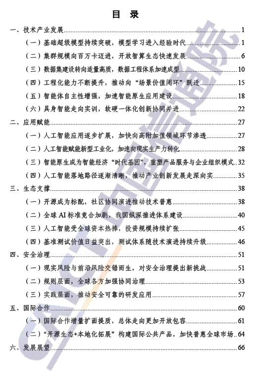 展望未来,人工智能将向通用智能持续突破,大模型推理效率优化、世界模型探索与具身智能升级成为关键方向,智算生态开放协同与安全治理动态防护体系构建将为产业高质量发展保驾护航。