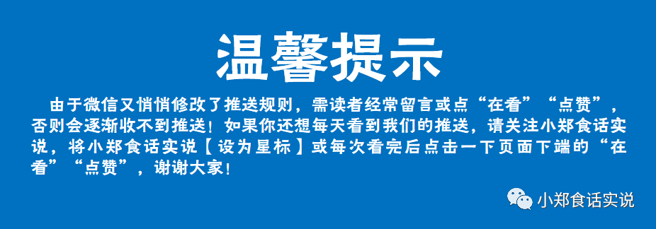 声明:1、本公众号注明“作者:小郑食话实说”的所有作品,版权均属于本公众号,未经本公众号授权不得转载、摘编或利用其他方式使用上述作品。已经本公众号授权使用作品的,应在授权范围内使用,并注明“来源:小郑食话实说”。违反上述声明者,本公众号将追究其相关法律责任。2、本公众号注明“来源:XXX(非小郑食话实说)”的作品,均转载自其他媒体或网站,转载目的在于传递更多信息,并不代表本公众号赞同其观点和对其真实性负责。文章内容未经本公众号核实,文章用于学习和交流,仅供参考,请自行核实相关内容。如因作品内容、版权和其他问题需要同本公众号联系的,请留言联系处理。