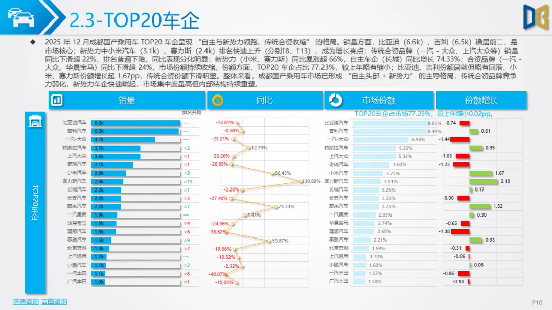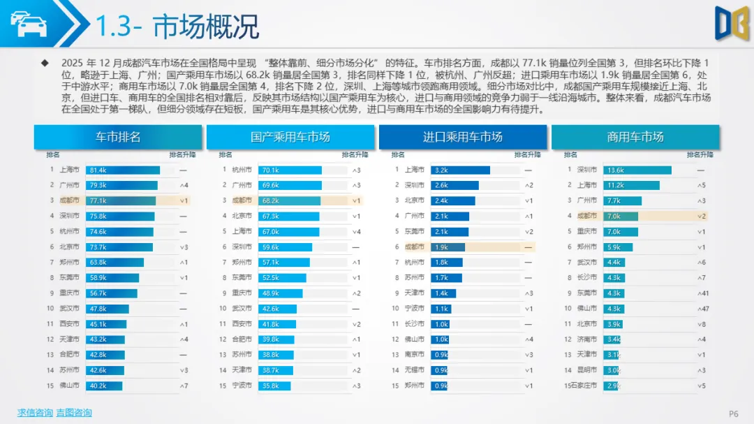 2025 年 12 月成都市汽车市场迎来年末消费冲刺行情,在全国新能源汽车购置税免税政策到期、行业电动化转型深化的背景下,依托西部核心消费城市的区位优势与宽松的消费政策,本地市场呈现出乘商双轨分化、新能源全面主导、国产强势崛起、进口持续萎缩的鲜明特征,成为全国车市 “西强中升、东部分化” 格局的核心缩影。