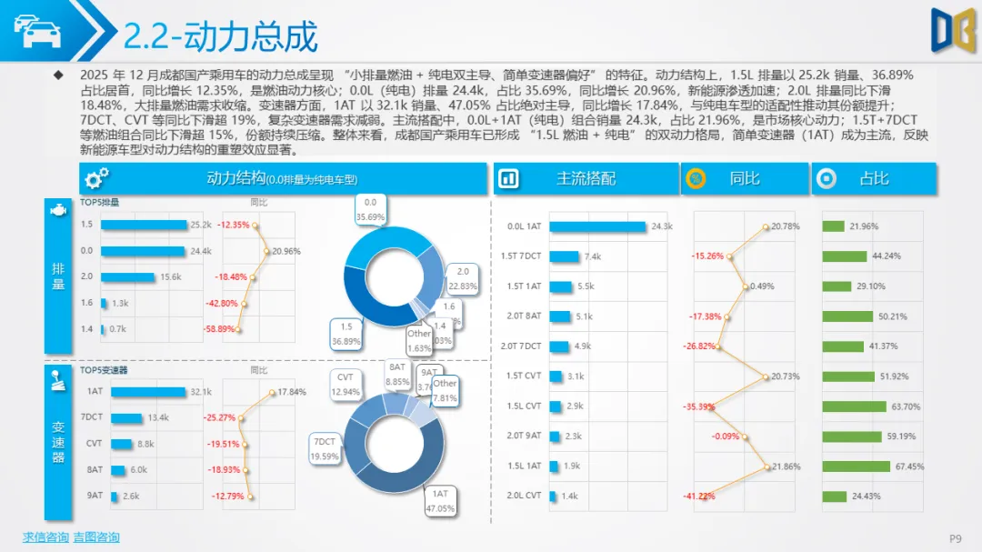 车型级别上,消费升级趋势进一步深化,B/C 级中高端车型成为轿车、SUV 的消费主流,A00、A0 等低级别车型销量与份额双降,MPV 市场更是由 C 级车型绝对主导,低级别车型几乎退出市场,反映出成都消费者购车需求从 “代步刚需” 向 “品质体验” 转变。品牌与车型竞争层面,新势力品牌彻底打破传统格局,小米 YU7 登顶 SUV 市场,特斯拉 Model 3 领跑轿车市场,问界、蔚来等新势力车型销量与排名大幅跃升,而传统燃油车车型则表现分化,多数主流车型同比下滑,自主品牌与新势力的市场份额持续提升。动力与变速器结构也随电动化发生深度调整,适配纯电车型的1AT 简单变速器成为全品类主流,大排量燃油动力需求持续收缩,小排量燃油仅在 MPV 领域留存少量市场,这一特征也与成都新能源汽车保有量稳居非限购城市第一的区域基础相契合。