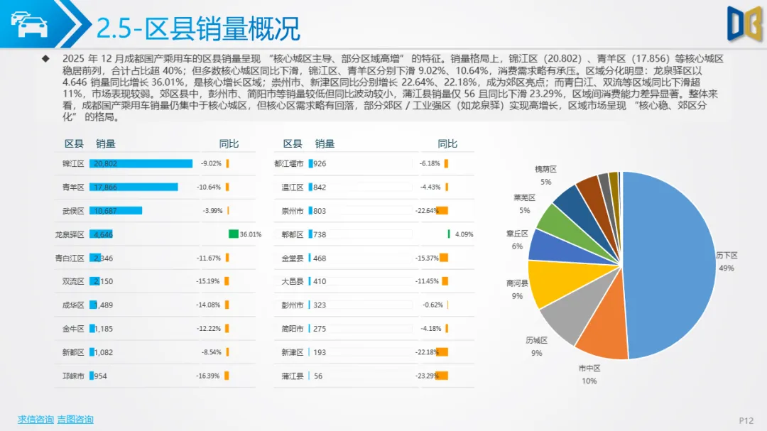 作为 2025 年全国汽车销量第一城,成都 12 月车市的表现既贴合全国新能源渗透率突破六成的行业趋势,又凭借本地完整的新能源产业链、公共领域电动化政策落地形成独特的区域发展逻辑,各细分板块的走势差异,更是折射出中国汽车市场从品牌导向到技术导向、从燃油主导到新能源主导的根本性变革。