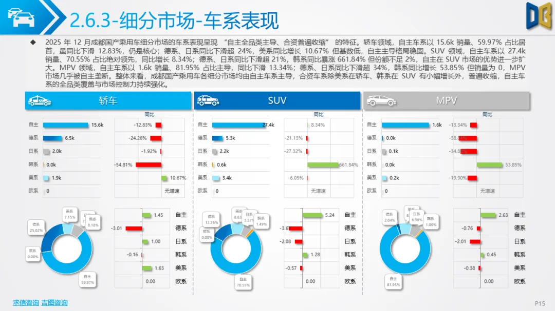 国产乘用车作为成都车市的绝对支柱,在12 月展现出电动化深度渗透、消费升级持续、新势力重塑格局的三重核心特征,成为拉动市场增长的核心引擎。受益于新能源购置税免税政策到期的末班车效应,成都国产乘用车新能源渗透率远超全国平均水平,轿车、SUV、MPV 三大细分市场新能源占比均超 54%,其中 SUV 纯电车型销量同比暴涨 57.10%,纯电车型成为轿车与 SUV 市场的绝对主力,MPV 市场则由插混车型主导,燃油车型全品类呈现同比下滑态势,传统燃油车的市场份额被新能源车型持续挤压。