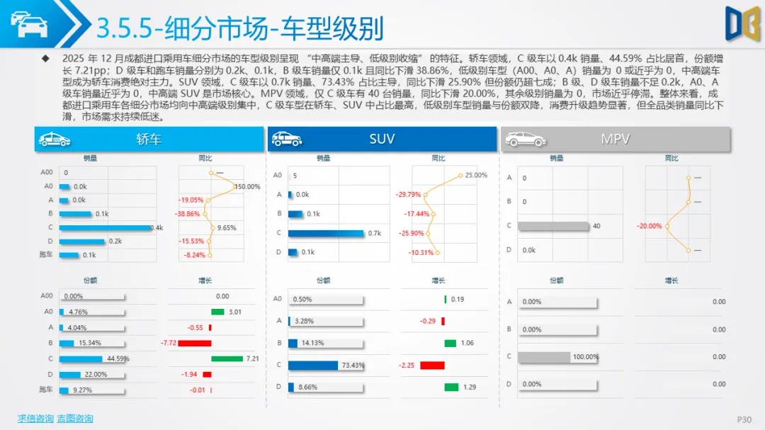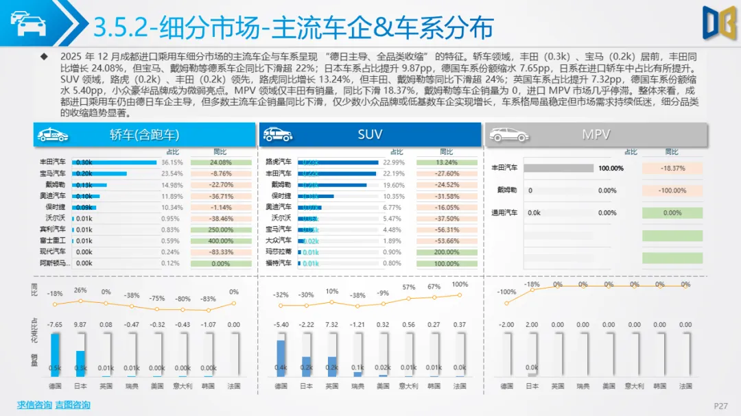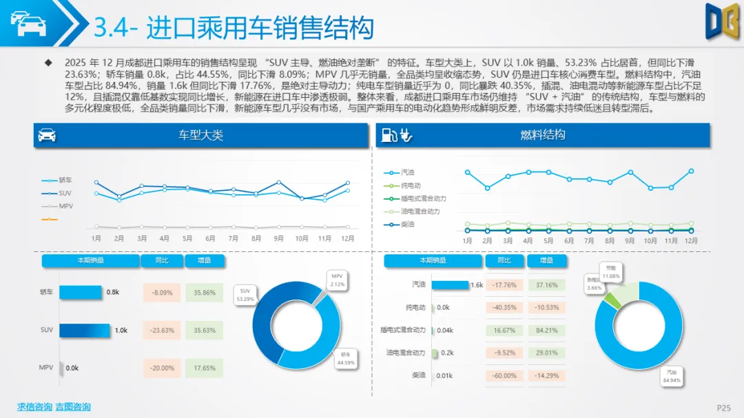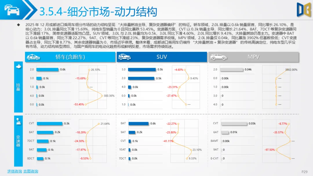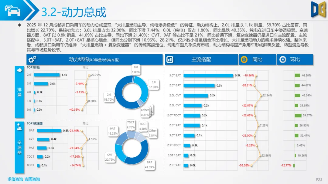 进口乘用车市场在 12 月虽迎来年末环比增长的短期冲刺,却难以扭转全年持续收缩、传统结构固化、转型严重滞后的整体颓势,成为成都车市的明显短板。12 月成都进口乘用车销量环比增长 35.29%,但同比仍下滑 17.32%,全年累计销量跌幅达 18.03% 且跌幅逐步扩大,市场需求持续疲软。从市场结构来看,进口车仍固守 “大排量燃油 + 复杂变速器” 的传统高端定位,2.0L、3.0L 排量占据超 90% 的市场份额,纯电车型占比不足 2% 且同比暴跌 40.35%,新能源渗透程度与国产乘用车形成天壤之别,与全国新能源进口量缩水三分之二的行业趋势一致。