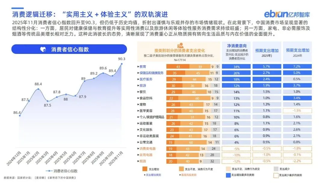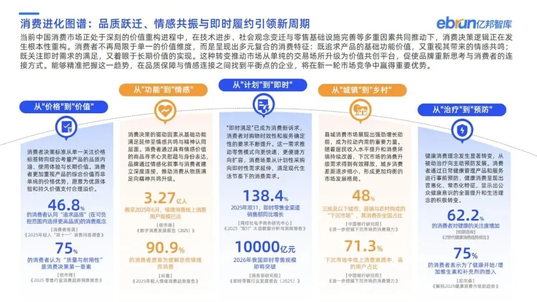 中国#消费市场 已全面迈入以存量精耕与结构性变革为特征的高质量发展阶段。在用户规模见顶、消费信心谨慎回暖的背景下,增长动力从“量”的扩张转向“质”的深耕,呈现出实用主义与体验主义并行、功能满足向情感共鸣跃迁的复杂图景。这一深刻变革,正催生一批能够精准把握#新消费 逻辑的品牌。
