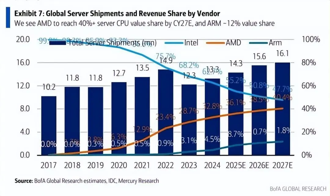 此次威尼斯 CPU 向2纳米工艺的切换,将成为 AMD 又一个高毛利增长引擎,助力公司实现服务器 CPU 市场营收市占率超 50%的目标。过去 7 年,AMD 在该领域的市占率已提升至约 28%,分析师预计其将在 2030-2032 年达成终极目标(美国银行分析师预测,2027 年其市占率将率先突破 40%)。