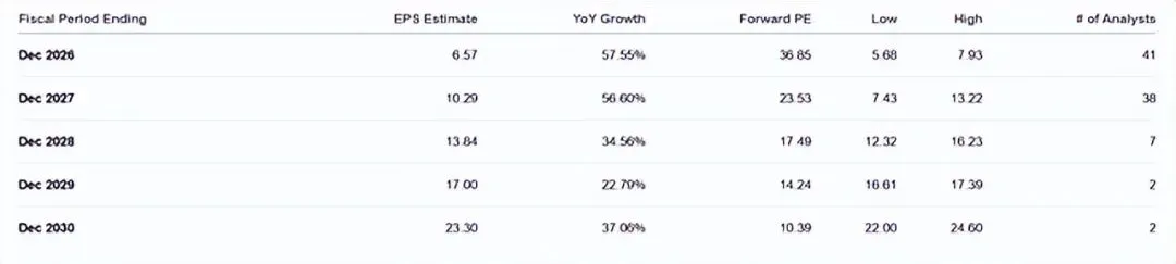 市场预期 AMD 未来五年每股收益和营收的复合年均增速分别超 37% 和 30%。基于 38 位华尔街分析师的一致预期,AMD 当前对应 2027 财年市销率约 6.4 倍,市盈率约 23.53 倍。