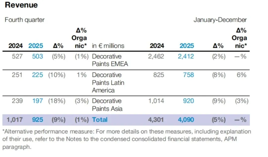 亚洲地区,合计贡献约28亿欧元(约合:32.99亿美元)营收,尽管该区域装饰涂料板块受印度业务剥离与严峻汇率折算影响,全年收入下降9%,但中国市场在行业整体疲弱下实现销量逆势增长,越南市场也表现强劲,部分缓解了印度尼西亚市场疲软带来的压力。