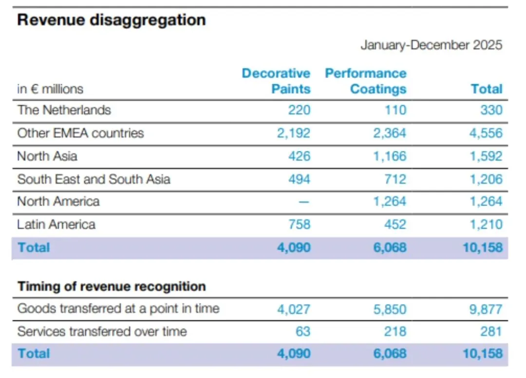 从区域贡献看,欧洲、中东及非洲(EMEA)作为公司的传统核心市场,2025年实现总营收48.86亿欧元,约占公司整体营收的45%。其中,荷兰作为公司总部所在地,营收为3.30亿欧元(约合3.89亿美元),其装饰涂料业务贡献突出,实现2.20亿欧元营收(约合2.59亿美元),高性能涂料贡献1.10亿欧元(约合1.30亿美元);其他EMEA国家合计营收45.56亿欧元(约合53.72亿美元),且高性能与装饰涂料两大业务发展均衡,装饰涂料实现21.92亿欧元(约合25.84亿美元)营收,高性能涂料实现23.64亿欧元(约合27.87亿美元)营收。