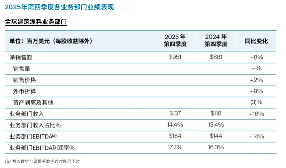 工业领域涂料业务第四季度净销售额16.41亿美元,同比增长3%,有机销售额增长4%,市场份额提升成为关键驱动力。汽车OEM涂料净销售额增长6%,连续两个季度产量跑赢全球汽车行业;包装涂料表现亮眼,有机销售额两位数增长,工业涂料有机销售额持平。板块EBITDA同比增长6%,利润率提升0.3个百分点至15.1%,展现出良好的盈利韧性。