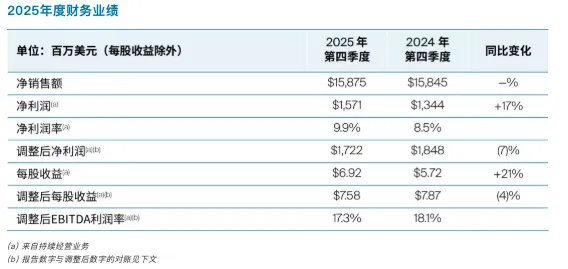 从全年业绩来看,PPG 2025年净销售额达158.75亿美元,与2024年的158.45亿美元基本持平,在全球工业终端市场需求承压的背景下,这份成绩单实属不易。全年净利润表现亮眼,达到15.71亿美元,同比大幅增长17%,净利润率从2024年的8.5%提升至9.9%。每股摊薄收益为6.92美元,同比增长21%,调整后每股收益7.58美元,即便较上年略有下降,仍在行业内保持领先水平。
