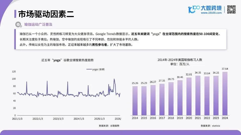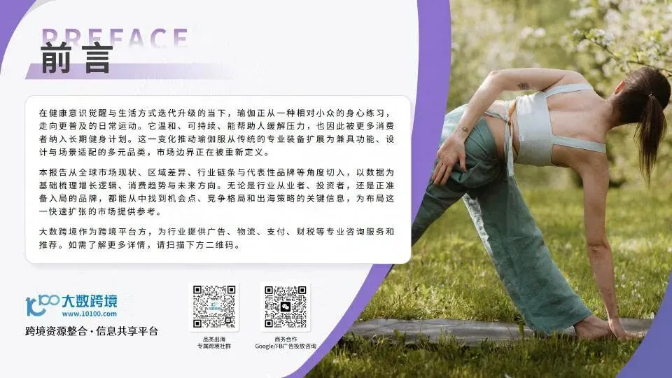 在健康意识觉醒与生活方式迭代升级的当下,瑜伽正从一种相对小众的身心练习,走向更普及的日常运动。它温和、可持续、能帮助人缓解压力,也因此被更多消费者纳入长期健身计划。这一变化推动瑜伽服从传统的专业装备扩展为兼具功能、设计与场景适配的多元品类,市场边界正在被重新定义。本报告从全球市场现状、区域差异、行业链条与代表性品牌等角度切入,以数据为基础梳理增长逻辑、消费趋势与未来方向。无论是行业从业者、投资者,还是正准备入局的品牌,都能从中找到机会点、竞争格局和出海策略的关键信息,为布局这一快速扩张的市场提供参考。