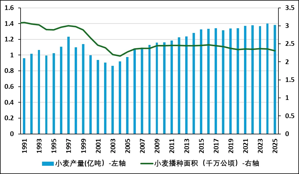图表 1 1991年至2025年我国小麦产量及面积