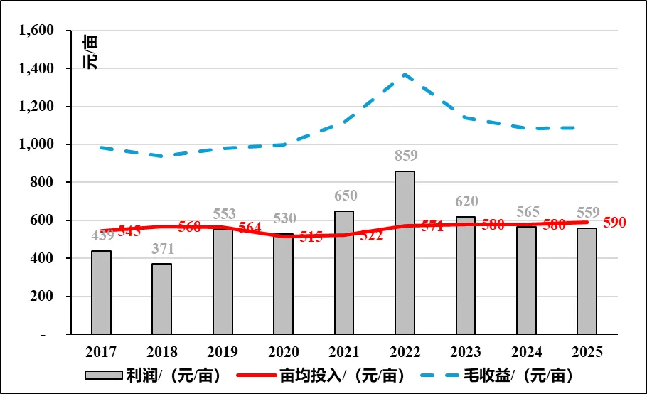 2025年因春、夏季干旱小麦灌溉需求增加,种植成本略升,收益同比下降。综合评估本年度小麦亩均投入约590元(不含地租),较上年略增。