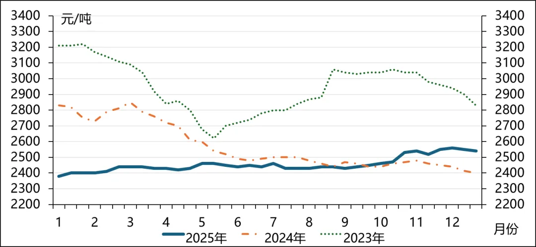 2025年小麦价格呈现止跌回升走势,以2410元/吨起步,以2540元/吨收尾,全年上涨5.39%。上半年玉米价格走强带动小麦饲用增加,4~5月新季小麦遭遇干旱影响生产,6月小麦托市启动支撑小麦价格,10月华北连阴雨导致当地玉米质量出现问题,引发更多小麦饲用替代,叠加秋播晚播引发新季产量忧虑再次拉高小麦价格。
