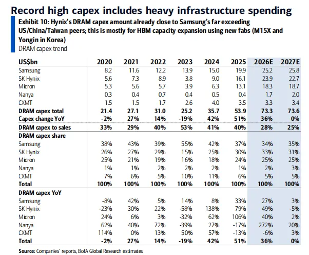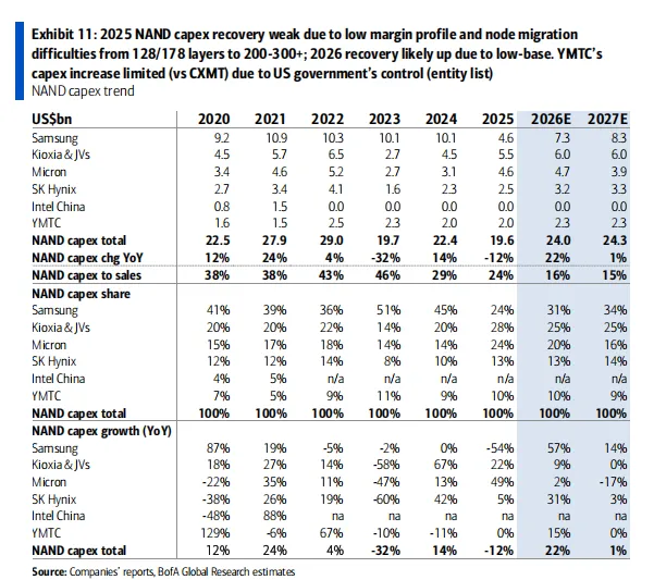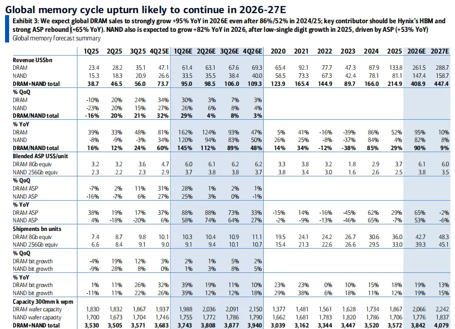 2026年DRAM销售额同比增长95%(达到2615亿美元),2027年同比增长10%; 2026年NAND销售额同比增长82%(达到1474亿美元),2027年同比增长8%; 但对于价格(ASP)的预测相对保守,其中2026Q1预测DRAM价格季度环比增长28%,已经低于上篇文章(2026年1月DRAM价格涨势仍在持续)所说的2026年1月涨幅就超过30%的幅度。