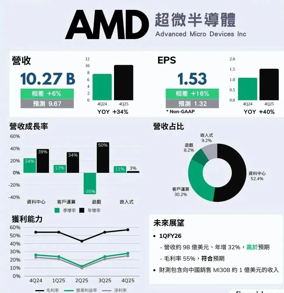 AMD 发布超预期财报,调整后每股收益 1.53 美元(预期 1.32 美元),营收 103 亿美元(预期 96.7 亿美元),下季度销售前瞻 98 亿美元(预期 94.2 亿美元)。但受市场情绪拖累,AMD 当日收跌 1.69%,盘后进一步下跌 7.92%。核心原因在于当前股价已部分反映 2026 年估值,市场需时间消化获利盘,以时间换空间。3. 微软与英伟达:防守态势