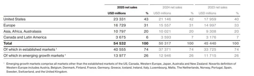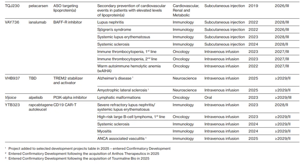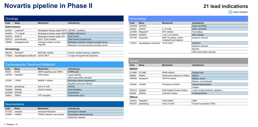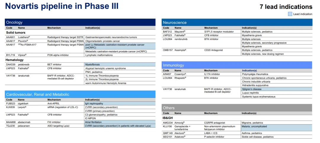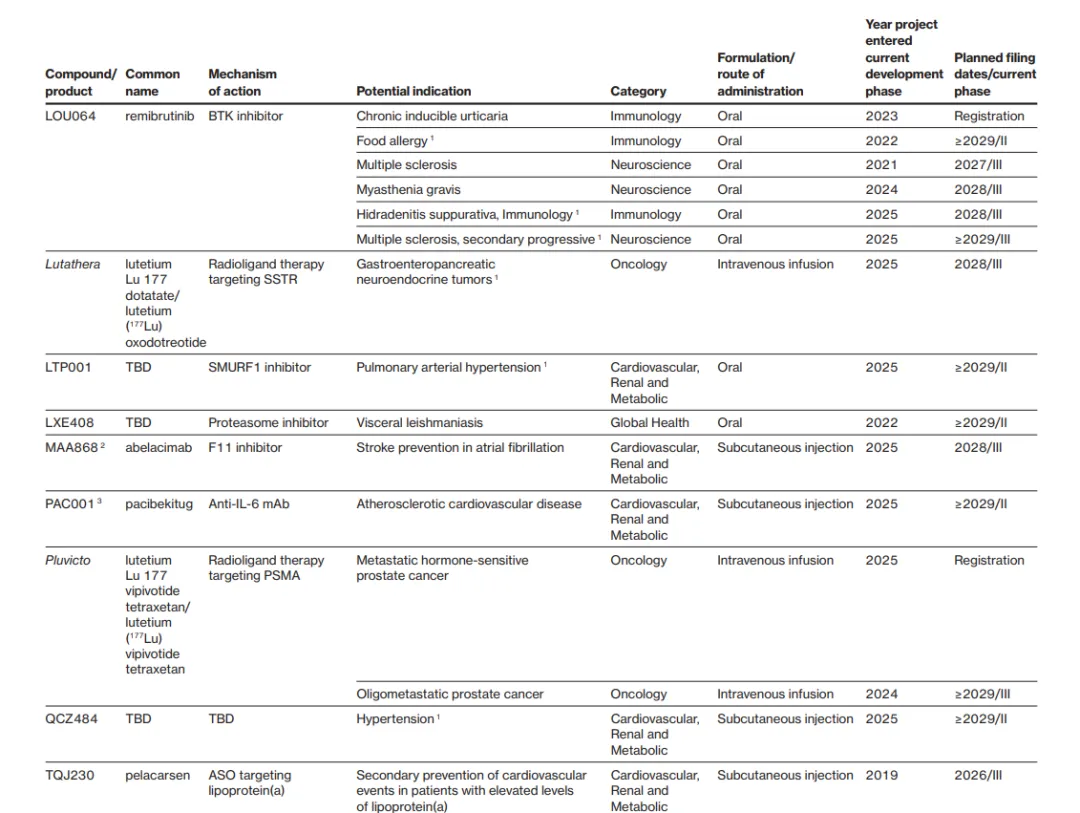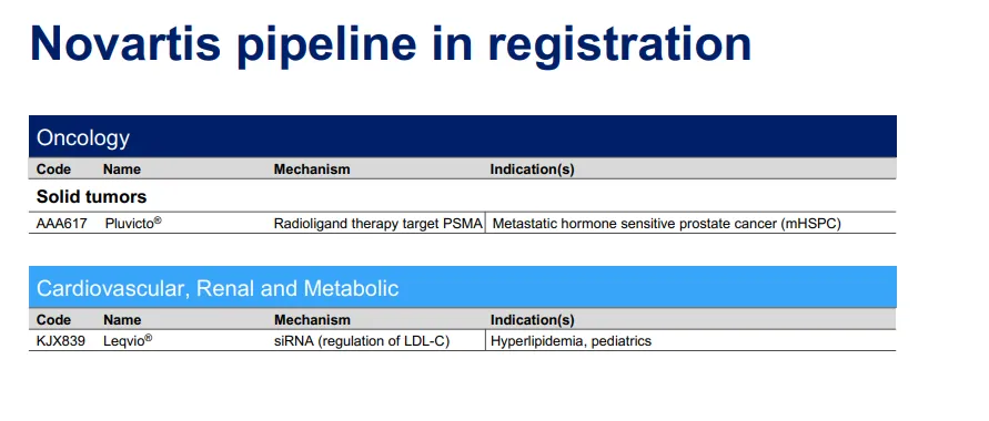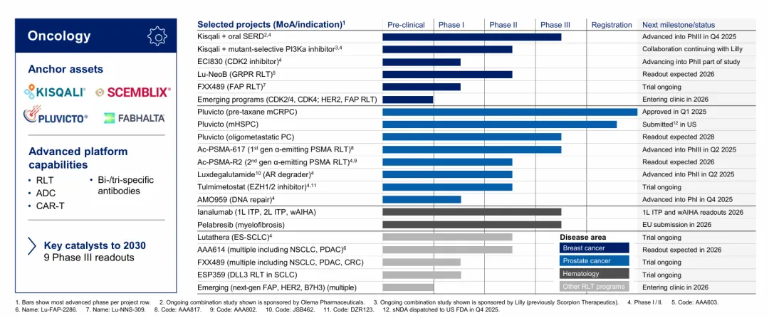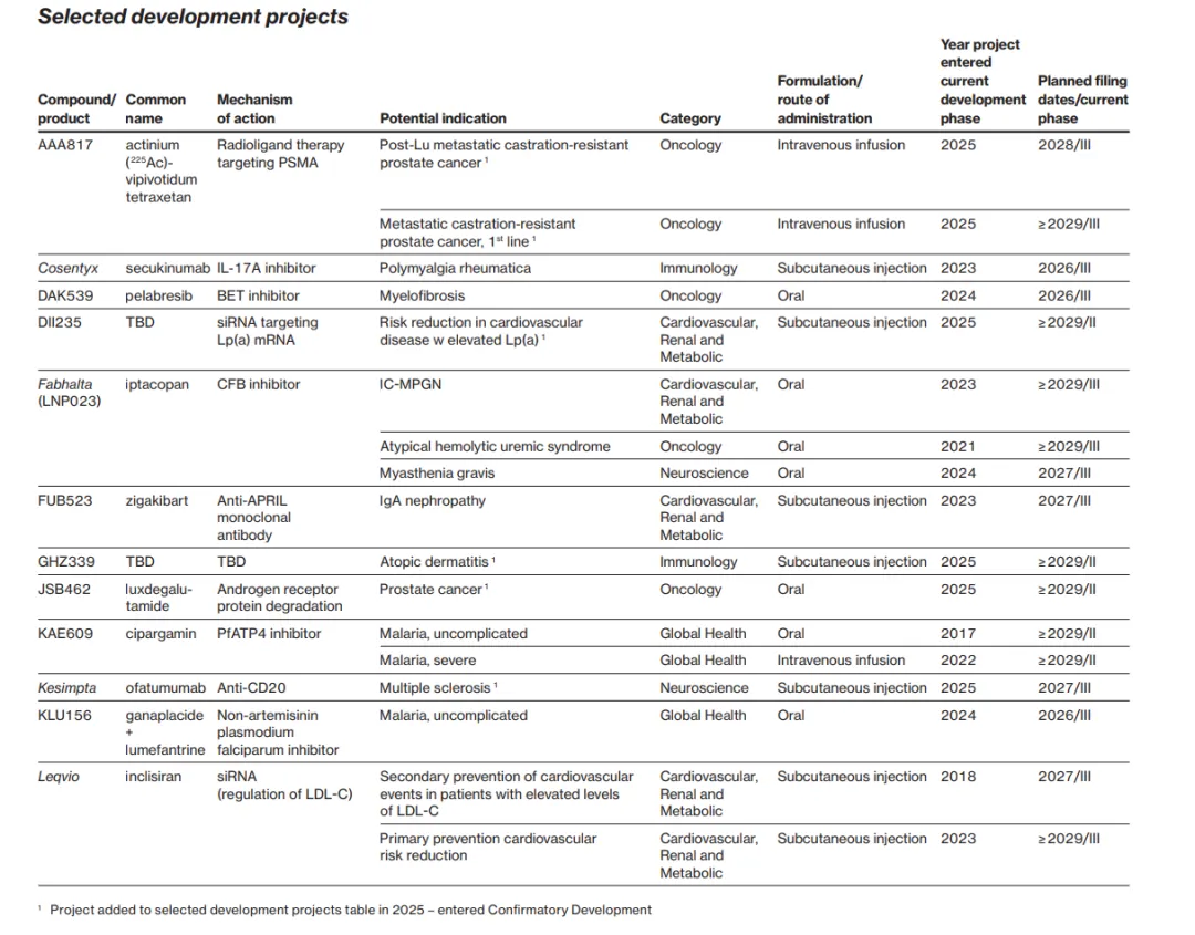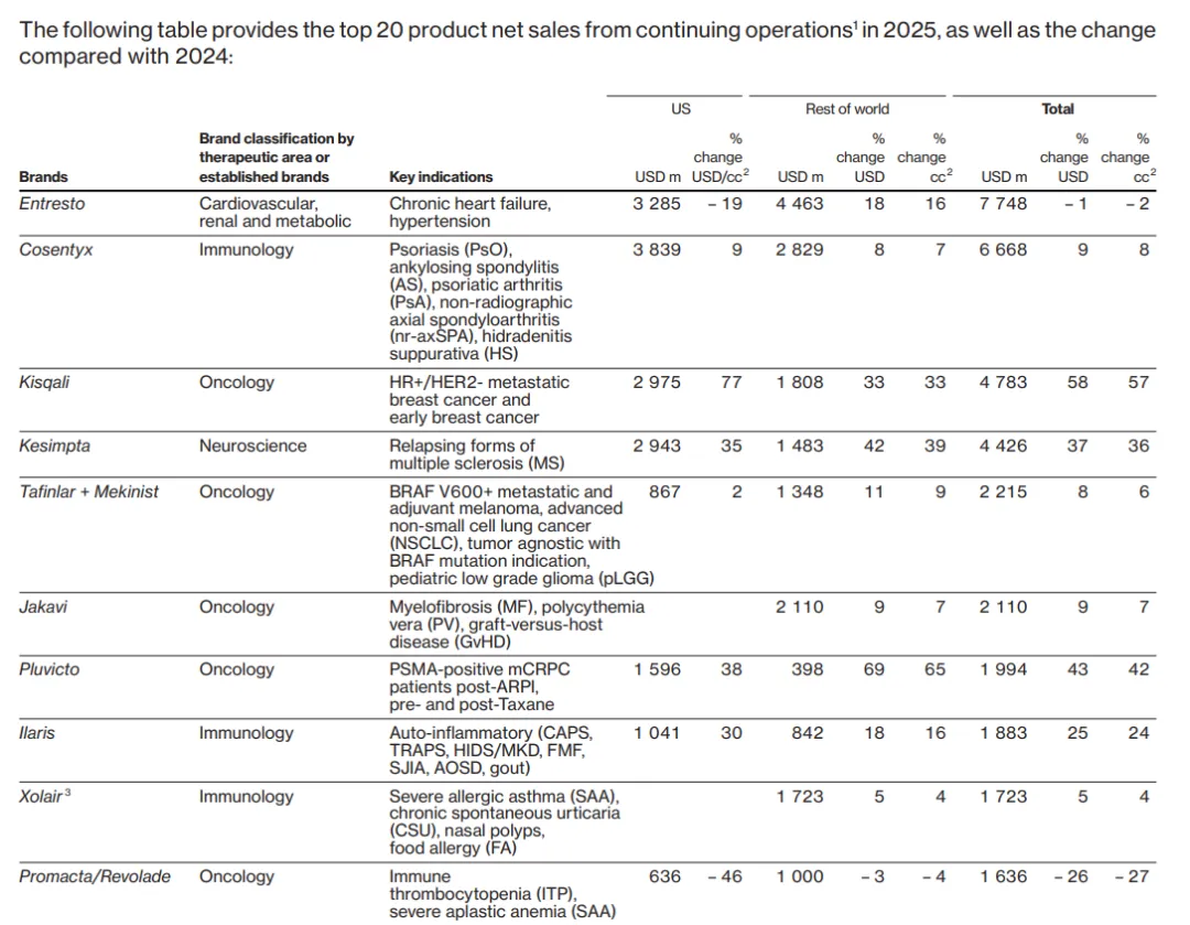 2月4日,诺华发布2025年业绩,全年净销售额为545.32亿美元,同比增长8%。其中美国和欧洲为主要市场,分别占43%和31%。核药产品——Pluvicto,全年销售额19.94亿美元(+42%);Q4销售额6.05亿美元,同比增长70%,美国市场大概占80%。另一个值得关注的是siRNA产品——Leqvio®, 是全球首个 siRNA 超长效降脂药物这个产品是由罕见病到慢病的开山之作。全年销售额11.98亿美元(+59%),跨过了成为i重磅产品的门槛;Q4销售额3.35亿美元,同比增长57%,美国市场大概占50%。中国已经在25年进入医保,26年将实现快速增长~其中Entresto(沙库巴曲缬沙坦)、Cosentyx(司库奇尤单抗) 和 Kisqali(瑞波西利),分别实现了77.48亿美元(-2%)、66.68 亿美元(+9%)和47.83亿美元(+58%)的销售额,位居前三肿瘤领域在临床阶段的产品主要偏向核药领域,前列腺癌是重点方向,汇集了PSMA,SSTR,GRPR, FAP 等靶点药物,临床前提到了新一代的FAP, HER2, B7H3产品。也是摸着ADC过河~广撒网自身免疫领域逐渐从il-7A的Cosentyx®,BAFFBTK,迭代到CAR-T 疗法