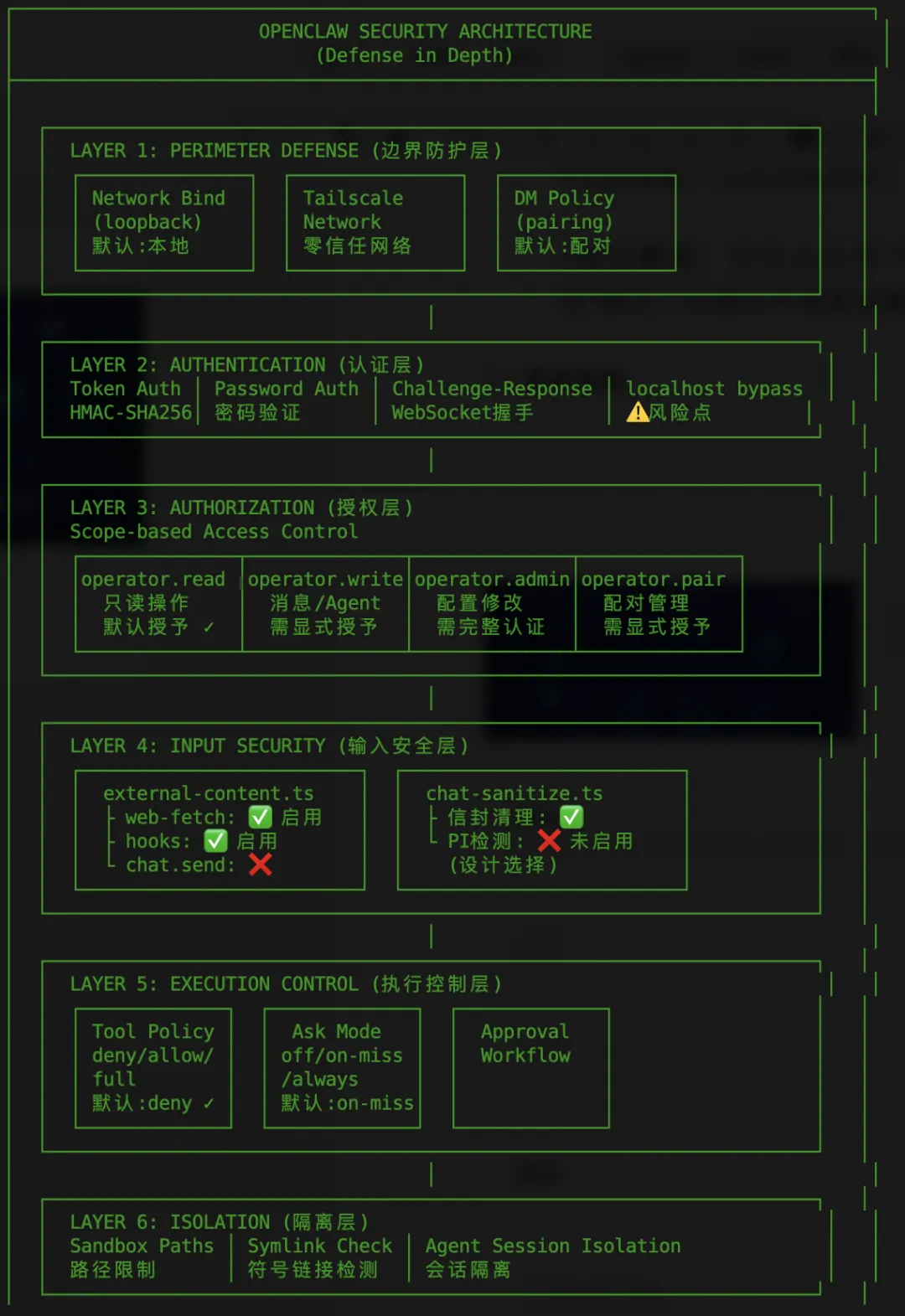 L5 | 执行控制 | 工具策略、命令白名单、审批 | ✅ 默认 deny |