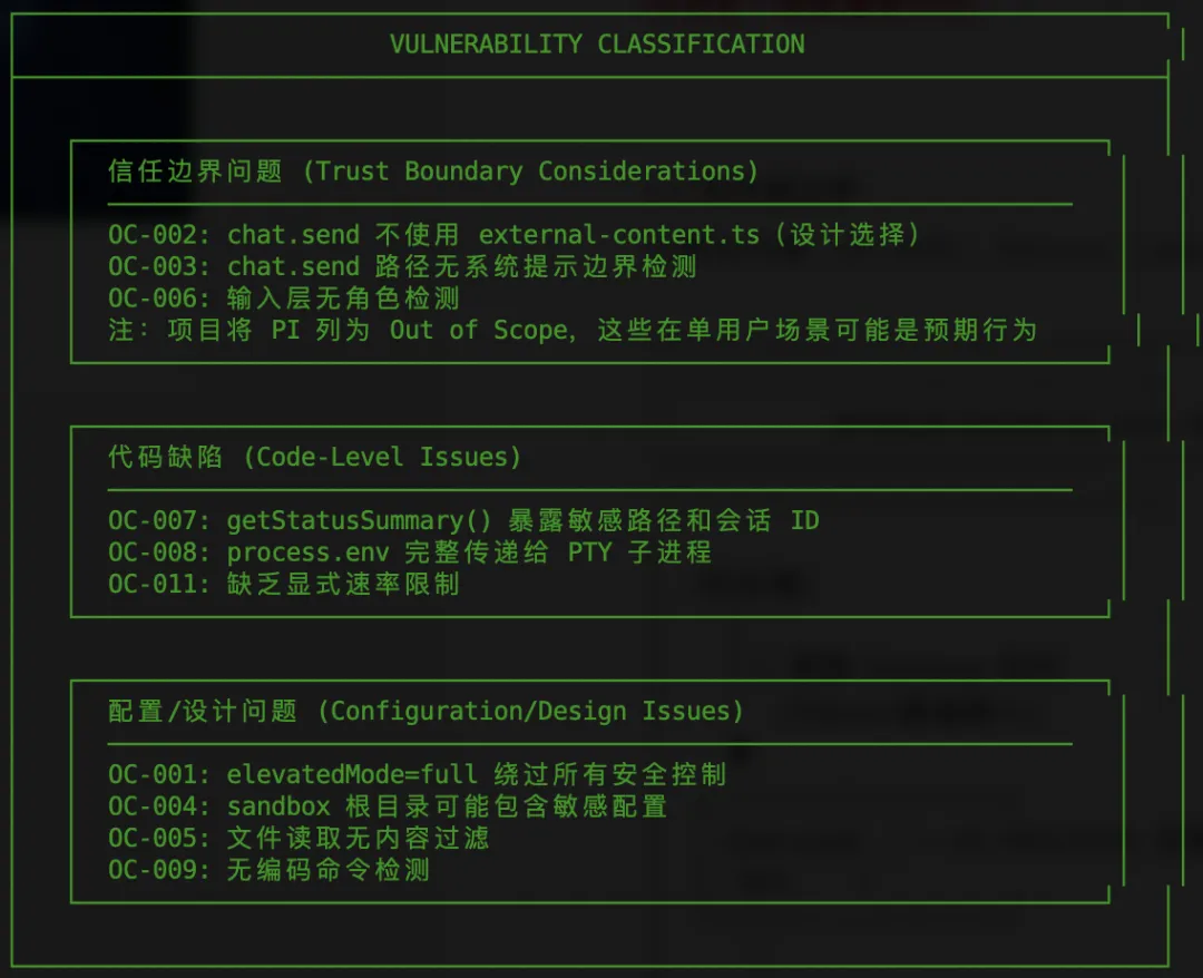 本次评估(?0201版本)共识别11个安全问题(OC-001至OC-011),涵盖配置设计、代码缺陷和信任边界三个维度。风险等级高度依赖部署场景:单用户本地部署风险较低,多用户和公开通道场景风险显著升高。