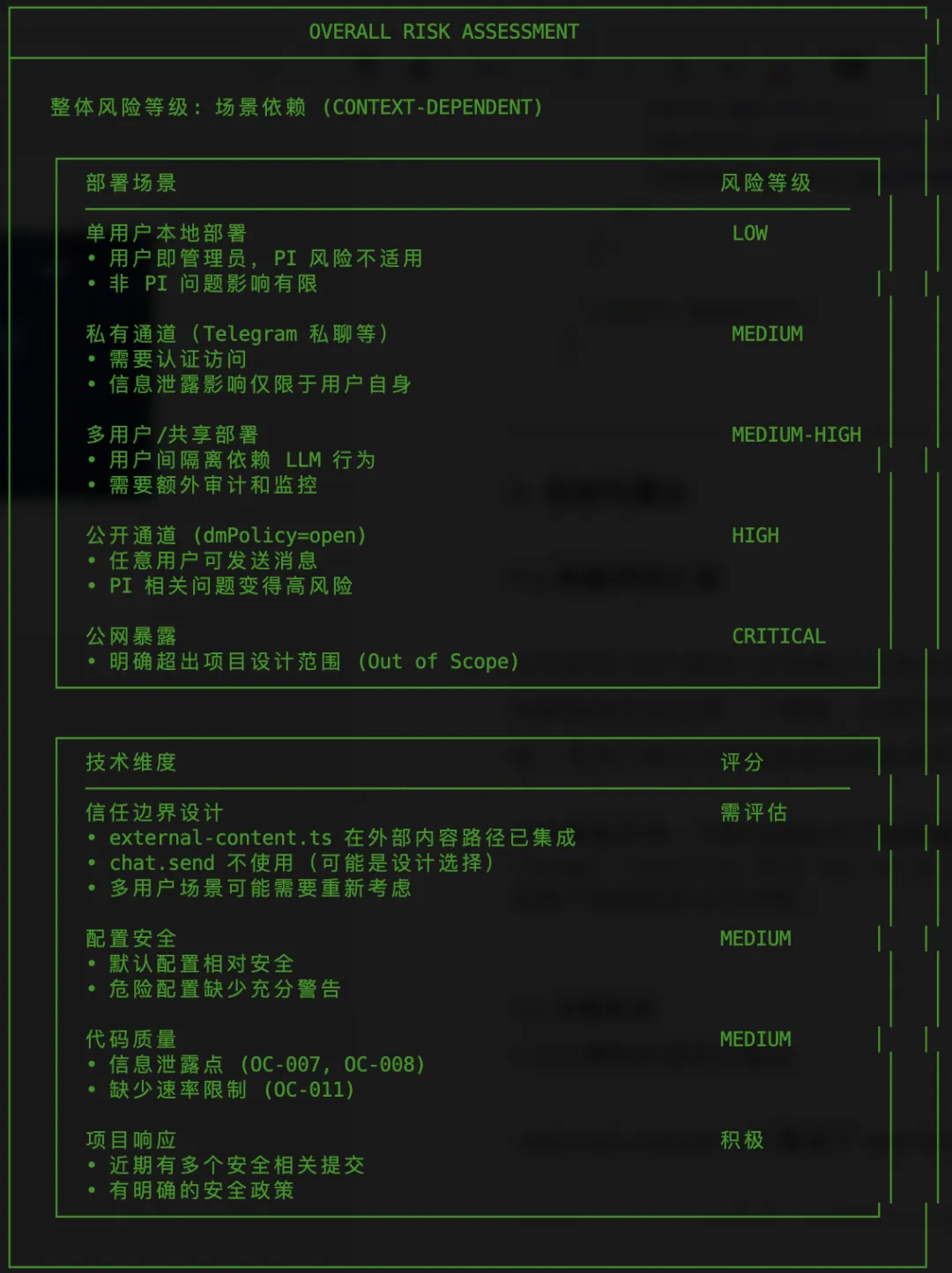 评估框架说明:风险等级取决于部署场景和信任模型。项目定位为本地 AI 助手,将 Prompt Injection 列为 Out of Scope,这意味着在单用户本地部署场景下,许多发现不构成(不被认为构成)实际安全风险。