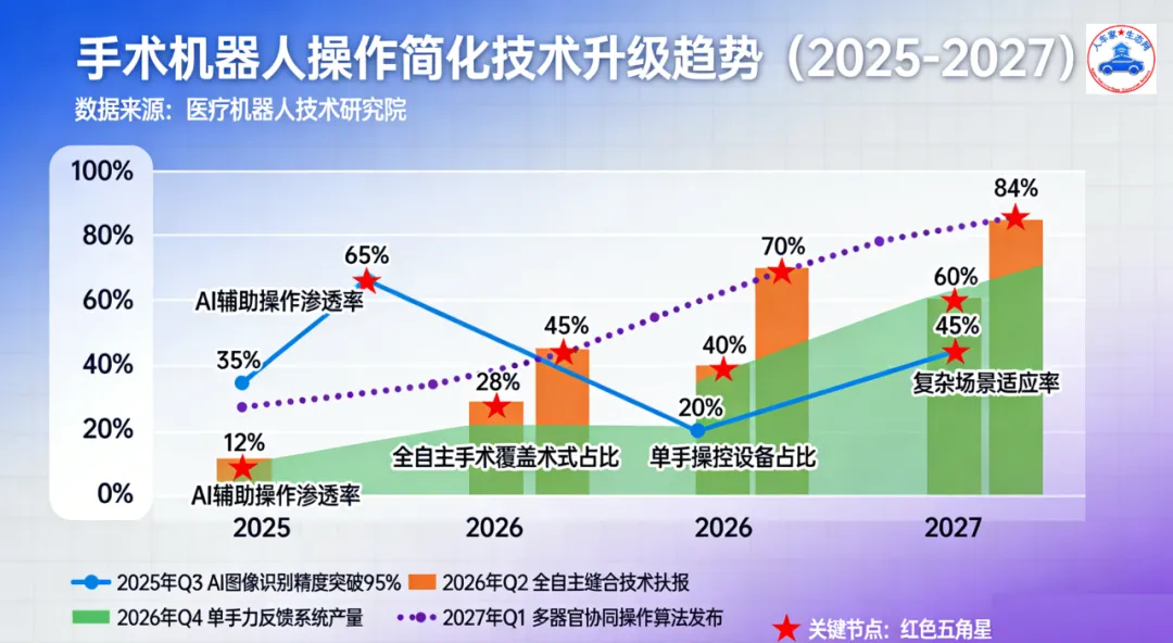 未来3-5年,AI技术将推动手术机器人操作简化实现质的飞跃,全自主操作场景逐步落地。预计2027年,AI辅助操作技术在手术机器人领域的渗透率将从2025年的40%提升至80%,自然语言交互、实时路径修正等功能将成为标配。技术突破方面,全自主手术系统将覆盖30%的常规术式,2025年已实现首例全自主胆囊切除术,患者模型操作准确率达100%;强化学习算法将使设备通用适应性从92%提升至98%,有效应对组织粘连等突发场景。企业层面,将加速开发轻量化操作终端,预计2026年单手操控型设备占比将突破50%,进一步降低操作门槛。