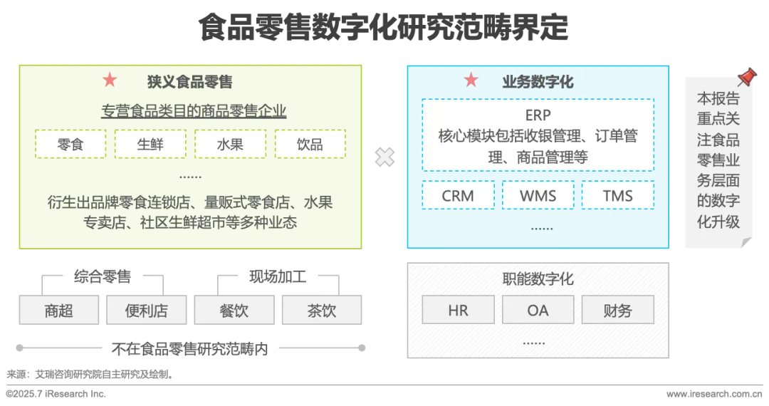 狭义的食品零售是面向终端消费者专营食品销售的商品零售业态,包括零食、水果、生鲜、饮品等类目,广义的食品零售则包括所有向终端消费者销售食品的企业。考虑狭义食品零售与商超、便利店等综合型零售业态及需要现场加工的餐饮、茶饮等业态在业务逻辑和核心竞争力上的不同,其数字化侧重点也存在一定的差异,本报告将聚焦狭义的食品零售概念进行展开。其中,ERP、CRM、WMS、TMS、OMS等服务业务部门的数字化系统是转型升级的关键,我们将重点讨论食品零售的业务数字化升级,HR、OA、财务等职能层面的数字化不作为本次研究重点。