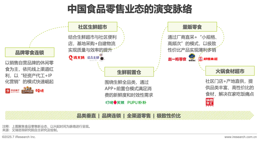 随着综合商超、便利店及夫妻老婆店等传统零售业态暴露出高损耗、低效率的弊端,聚焦特定品类的垂直细分业态成为应对行业竞争的一种差异化手段。品牌零食连锁、社区生鲜超市、生鲜前置仓、量贩零食、火锅食材超市等多种垂类新兴业态兴起,加速了食品零售行业整体的连锁化进程。一方面,品类聚焦有利于创业公司在短期内建立品牌认知,另一方面,减少SKU复杂度,提升单品采购规模也有利于降低运营成本,使得头部企业能够通过标准化的店型快速扩张。与此同时,效率革命贯穿始终。新兴业态通过减少中间环节,如采用原产地直采的方式,或在社区周边设立小型仓库或前置仓等方式,优化供应链效率,打造极致性价比。