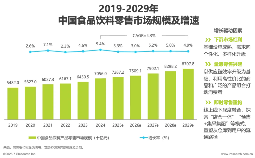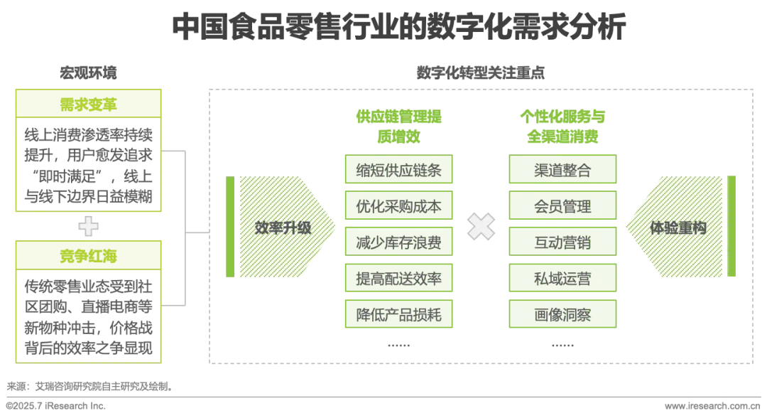 中国食品零售行业的整体规模非常庞大,2024年食品饮料零售GMV已经超过7万亿元,预计到2029年将增长至8.7万亿元。从增长驱动因素来看,下沉市场受益于物流等基础设施的完善和需求侧消费升级的趋势,将产生巨大的规模红利。与此同时,量贩零售模式加速对供应链端改造,以高性价比的优质产品占领市场,而即时零售模式侧重线上线下的深度融合,依靠“线上下单-即时配送”满足碎片化消费需求。在这一过程中,数字化越来越成为食品零售企业关键的竞争要素,相关数字化厂商如能把握市场红利,未来成长空间将更为广阔。