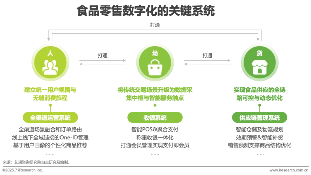食品零售数字化的核心在于重构人、货、场三者的协同关系。其中,“人”的数字化聚焦消费者,需构建以消费者为中心的全渠道运营体系;“货”的数字化强调商品全链路透明可控,要求建立高效透明的供应链管理体系;“场”的数字化则关注传统交易场所向数字化中枢转型。在此过程中,收银系统将作为关键数据的触点,与供应链管理系统、全渠道运营系统共同构成食品零售数字化的“铁三角”。三者联动,以消费者行为数据驱动商品优化,供应链响应效率赋能全渠道履约,推动食品零售行业从单点数字化向全面的人货场协同进阶。