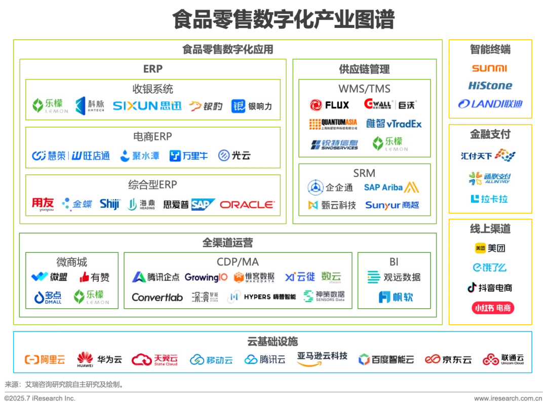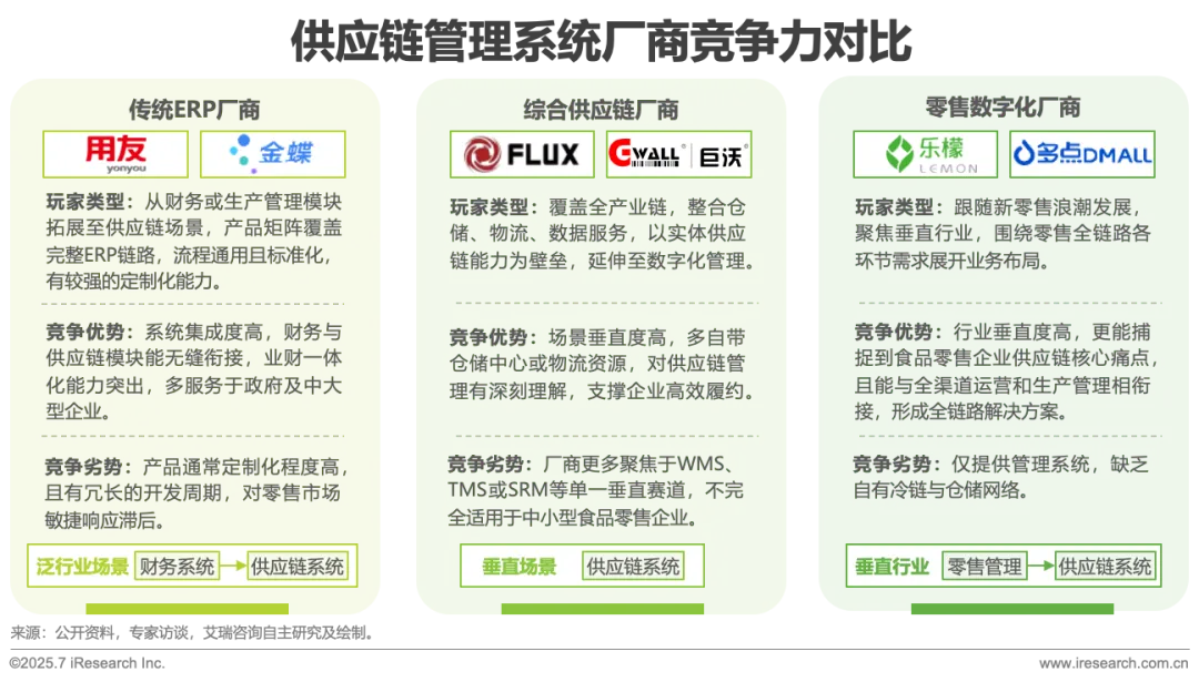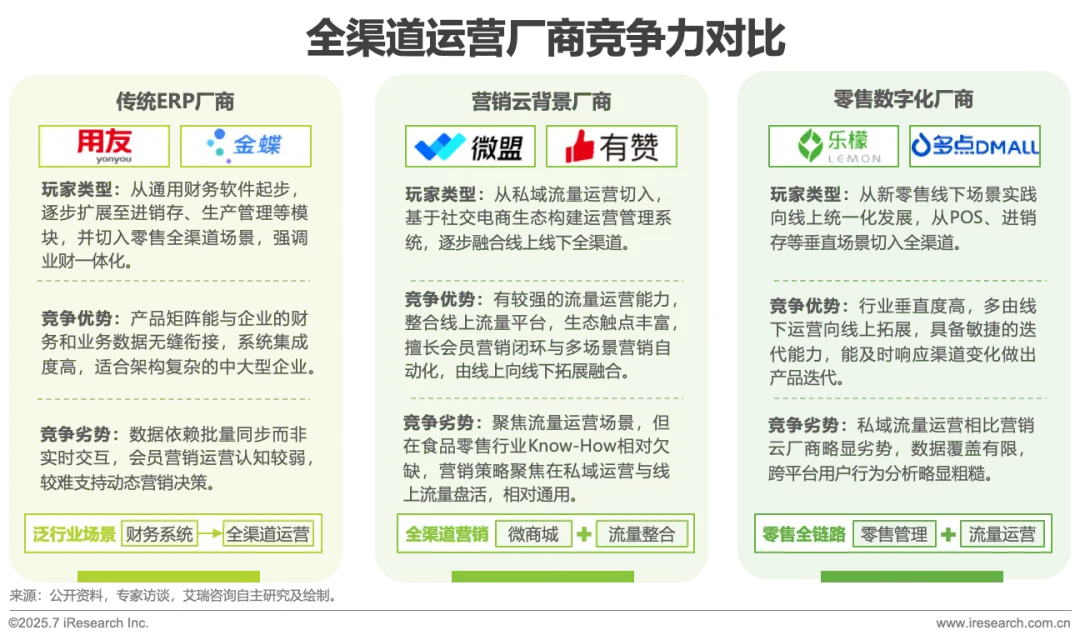 服务食品零售全渠道运营的厂商根据优势及厂商背景可分为三类:(1)传统ERP厂商:依托系统集成与业财协同优势服务大型企业,早期非云原生架构导致容器化部署滞后;(2)营销云背景厂商:以云原生底座支撑敏捷迭代,通过AI驱动公私域流量自动化运营;(3)零售数字化厂商:依托行业场景深度优化流量转化。三类厂商均朝着优化基础产品架构、强化行业垂直算法、多维数据智能分析的方向发展,最终以“云原生基座+全域数据智能+场景化工具”重构全渠道流量运营竞争力。