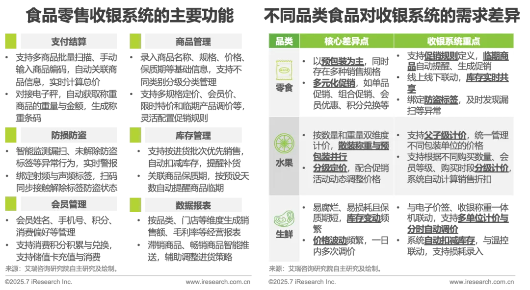 食品零售收银系统通过集成支付结算、商品管理、防盗防损、库存管理、会员管理等模块,帮助企业提升收银链路的运营效率,精准控制食品的损耗与成本,同时以数据驱动选品和营销策略。收银系统作为食品零售企业连接消费者的重要场所,是连接人-货-场的数据中枢,将持续推动企业向数字化决策转型。细分行业角度来看,不同品类因其自身特征和销售方式的不同,收银系统也需要适配各品类对多规格销售、促销规则和保质期管控等需求。如零食以预包装为主,侧重多元化促销,水果存在散装称重与预包装并存的情况,依赖父子级计价和分级定价,生鲜易损耗且价格波动频繁,强调时效性管理。