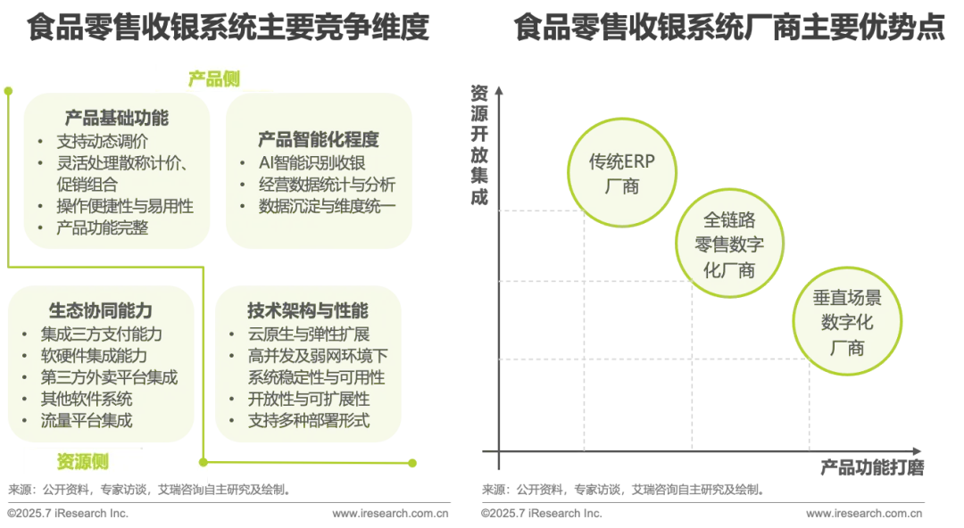 食品零售收银系统的竞争力核心在于厂商的场景理解深度、产品功能稳定性和业务的生态广度:(1)垂直场景适配能力:产品的场景适配与理解是厂商竞争力的核心壁垒,包括产品易用性、功能覆盖与智能化程度。(2)产品技术性能:通过云原生底座、容器化架构等形式保障收银产品在促销、节假日等高并发场景下的稳定性与可用性。(3)开放生态协同:体现厂商对上下游资源的整合能力,亦是厂商对食品零售企业业务全链路数字化的覆盖能力。未来厂商在收银领域的竞争焦点在于全链路数据联通与智能化分析,串联零售企业各业务场景,实现高效协同与提效。