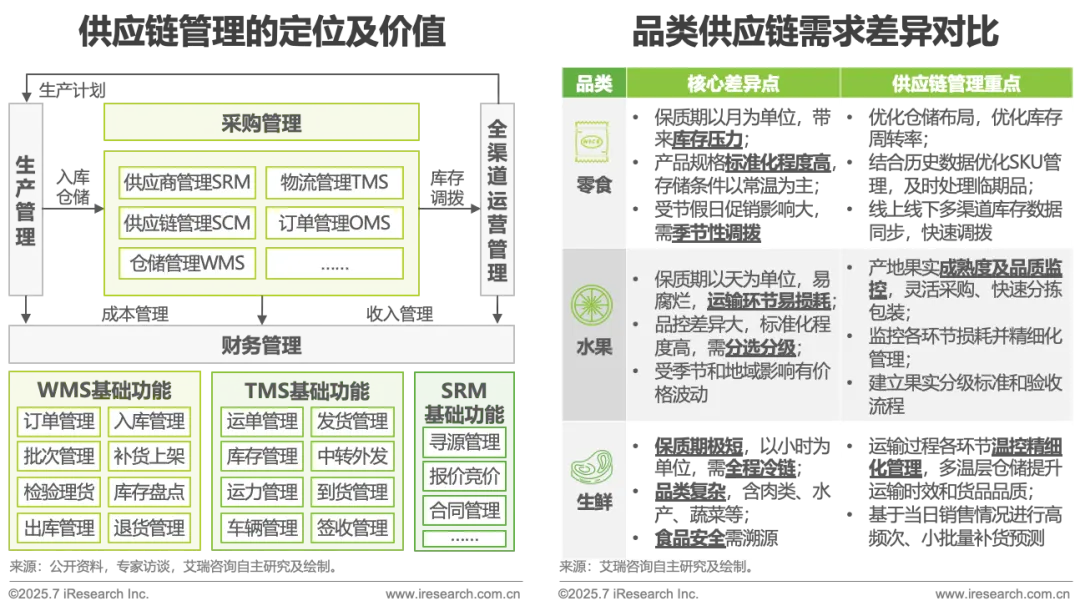 对于食品零售行业中生鲜易腐、水果季节性波动、零食需求多元等复杂特性,SCM系统通过数字化整合从源头采购到终端销售的全程资金流、物流和信息流,从提效率、控成本、抗风险三个维度赋能食品零售企业。(1)提效率:利用算法预测多变的消费需求,实现智能补货与库存优化,降低生鲜、水果的巨额损耗和库存资金占用。(2)控成本:通过协同供应商与物流资源,提升采购议价能力与配送效率,节省运输成本,同时保障商品尤其是短保品类的快速周转与新鲜度。(3)抗风险:能实时跟踪并灵活应对供应链紧急状况,同时,严格的批次管理与全链路追溯能力辅助企业构筑食品安全的防线,以满足日益严苛的合规要求。