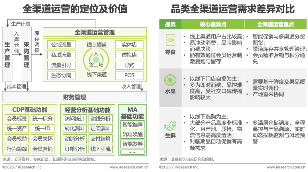 全渠道运营系统是食品零售企业整合多触点业务、沉淀数据资产、重构人货场关系的中枢引擎,通过整合线上线下数据流、物流与资金流,重构价值链:(1)数据沉淀:统一沉淀商品、会员、交易数据,构建统一的会员标签体系与销售数据分析体系。(2)盘活客户:基于全域行为画像实现精细化运营,从流量获取转向用户LTV挖掘。(3)经营分析:整合全域销售数据,分析转化率与健康度,完成数据反哺业务的闭环。在营销运营环节,零食需应对高频次、多SKU的长尾需求,强调渠道差异化定价与精准营销。水果易受季节与时效影响,需分级定价与损耗控制。生鲜因高损耗、短保鲜期,核心诉求在于以销定产与快速周转,关注临期品促销。