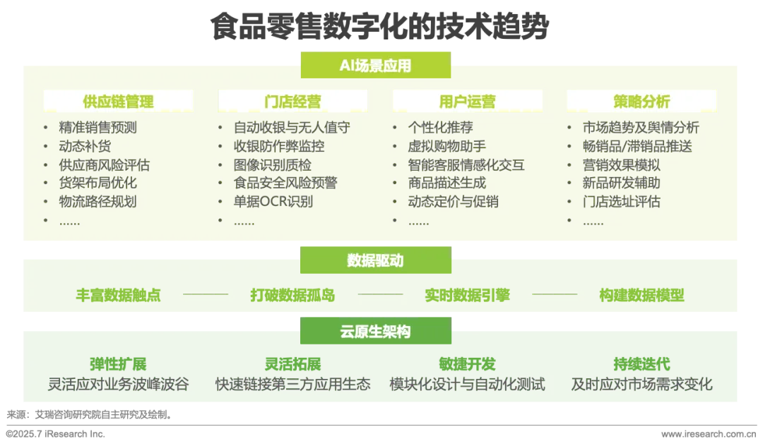 食品零售数字化厂商将加速构建云、数、智三位一体的技术闭环:1)云原生架构在弹性扩展、灵活拓展、敏捷开发和持续迭代等方面优势凸显,为要求业务敏捷、能够适应市场变化的食品零售企业提供了强有力的底层支撑;2)打通各业务系统,建立商品、用户和供应链的全链路数据体系,可以帮助客户改变传统的经验驱动模式,转向更加科学的数据驱动;3)在AI应用方面,大模型技术的快速发展为AI+零售提供了新的可能性,将决策式AI与生成式AI融入到供应链管理、门店经营、用户运营、决策辅助等环节中,推动食品零售的数智化升级。