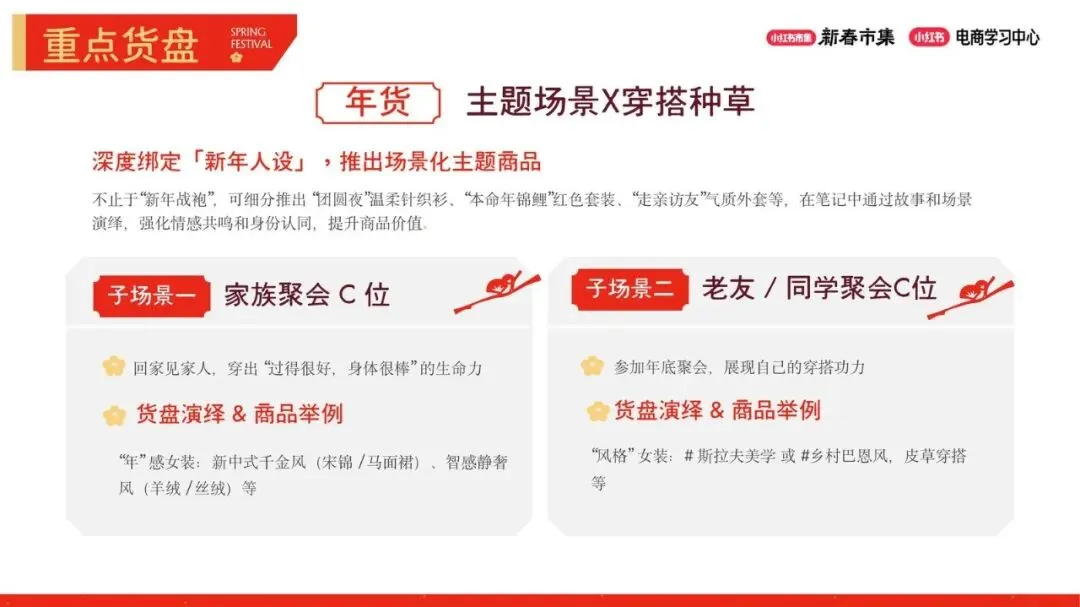 针对新春营销节点,报告为商家规划了清晰的货盘策略,主要分为现货清仓、年货主题和早春上新三大板块。清仓环节的核心是加速资金回流,商家可通过设置店铺现货专区,配合梯度降价、限量秒杀等强福利机制,并借助“年前衣橱大换血”等话题营造清仓仪式感,快速去化库存。年货主题则强调场景化与情感链接,建议商家深度绑定“新年人设”,细分出“家族聚会C位”和“老友同学聚会C位”等子场景,推出如新中式、智感静奢风等契合节日氛围的“年感”女装,通过笔记故事强化情感共鸣。早春上新部分鼓励商家提前测款与独家首发,报告分析了不同年龄人群的品类偏好与增速,为商家选品提供了数据参考,例如30岁以下人群偏好基础显瘦款,而35岁以上人群则对新中式、老钱风等调性品类有更高需求。