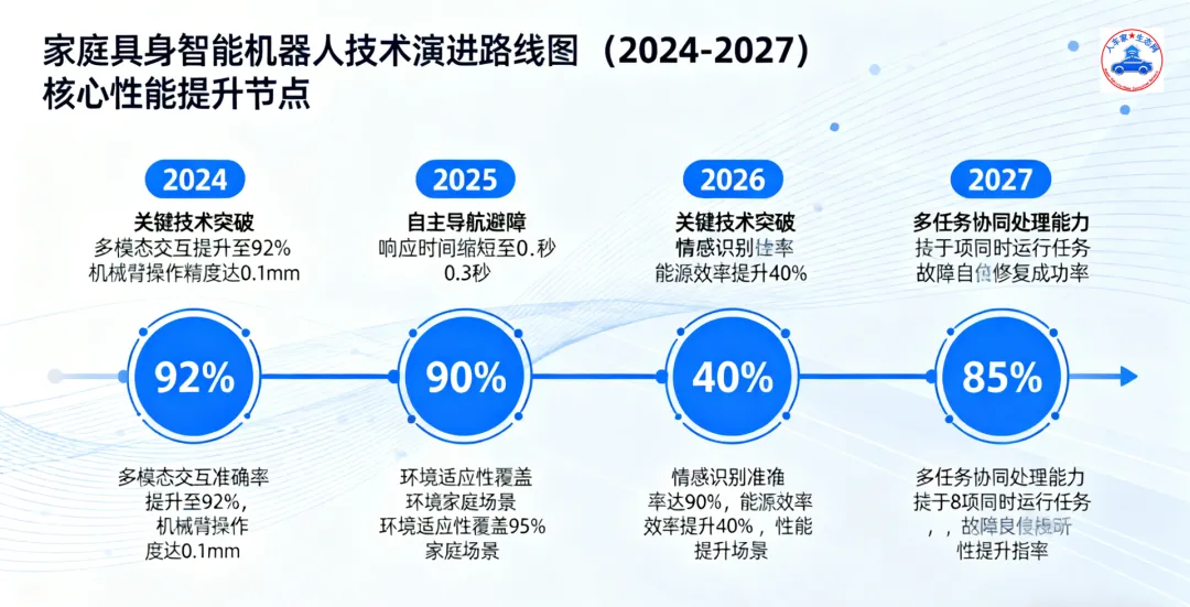一、行业现状:技术突破 + 需求释放,家庭服务机器人加速落地具身智能技术商业化落地推动市场扩容,2024 年全球家庭服务机器人市场规模达 890 亿美元,同比增长 32%,其中具身智能品类贡献核心增量,占比从 2022 年的 15% 跃升至 2024 年的 41%。中国市场表现亮眼,2024 年家庭具身智能机器人销量突破 600 万台,同比增长 58%,家庭渗透率从 2023 年的 8.7% 提升至 14.2%,一线及新一线城市渗透率已达 23.5%,成为早期普及核心区域。具身智能机器人融合大模型与机械执行能力,2024 年行业平均环境感知准确率达 96.3%,可精准识别家庭场景中的 120 + 种常见物体,复杂任务完成率提升至 88%(如自主规划清洁路径、按需取放物品)。人机交互体验显著优化,自然语言理解准确率达 97.1%,支持方言识别、多轮对话及意图预判,机械臂灵活度提升至 7 自由度,可完成开关柜门、摆放餐具等精细操作,用户满意度达 89%。家庭服务场景从单一清洁向多元化延伸,核心需求集中在:居家清洁(占比 45%,如地面清洁、衣物护理机器人)、养老陪护(28%,如健康监测、情感陪伴机器人)、育儿辅助(17%,如早教互动、安全看护机器人)。2024 年养老陪护类具身智能机器人销量同比增长 72%,育儿辅助类增速达 65%,其中具备 “健康数据监测 + 紧急呼叫” 功能的产品成为银发家庭首选,溢价能力较普通机器人高 30%。数据来源:艾瑞咨询《2024 中国家庭服务机器人消费调研》、京东超市年度销售数据核心消费群体为 25-50 岁中高收入家庭,其中女性决策者占比 62%,35-45 岁育儿 / 养老家庭为消费主力(占比 53%)。用户付费意愿持续增强,2024 年家庭具身智能机器人平均客单价达 8900 元,较 2023 年提升 18%,其中 1 万元以上高端机型销量占比达 27%,超 60% 用户表示愿意为 “个性化服务 + 智能交互” 功能支付溢价。二、未来走势:技术融合 + 场景深耕,行业进入高速成长期AI 大模型与机器人硬件深度耦合,2026 年预计实现 “视觉 + 听觉 + 触觉” 多模态感知全覆盖,复杂场景任务完成率突破 95%。轻量化、低功耗技术普及,2025 年家庭具身智能机器人平均续航时间将从 2024 年的 4.2 小时提升至 6.5 小时,机身重量下降 30%。跨设备互联能力强化,2027 年将实现与智能家居系统联动率达 85%,可同步控制灯光、家电等设备,构建全域智能生态。数据来源:MIT Technology Review《2025 全球机器人技术趋势报告》、头部企业技术路线规划针对特殊人群的定制化方案将快速增长,2025-2030 年适老化定制机型市场规模年复合增长率预计达 68%,将新增 “失能老人护理”“认知障碍辅助” 等细分场景。商业家庭融合场景崛起,如 “社区 - 家庭” 联动的健康管理机器人、公寓楼共享服务机器人,2028年此类场景市场占比将从2024 年的 7% 提升至 22%。全球多国出台支持政策,中国 “十五五” 规划明确将具身智能机器人纳入战略性新兴产业,2025-2030年预计投入超 500 亿元支持技术研发。行业生态加速完善,目前已形成 “芯片 - 算法 - 硬件 - 内容” 完整产业链,全球 Top10 企业市场占比达 65%,预计 2027 年市场规模将突破 2000 亿美元,中国家庭渗透率有望达 35%。成本持续下降,2026 年入门级具身智能机器人价格将降至 5000 元以下,推动下沉市场普及。欢迎与您就该主题 进行深入交流探讨renchejia@foxmail.com