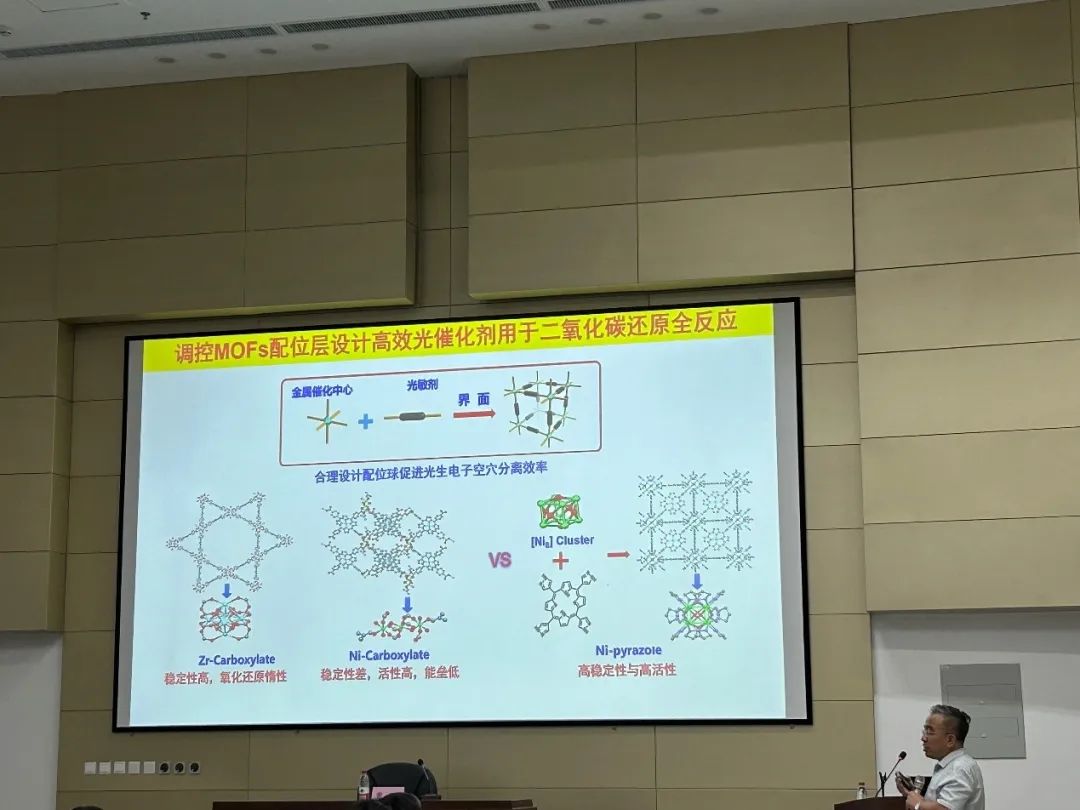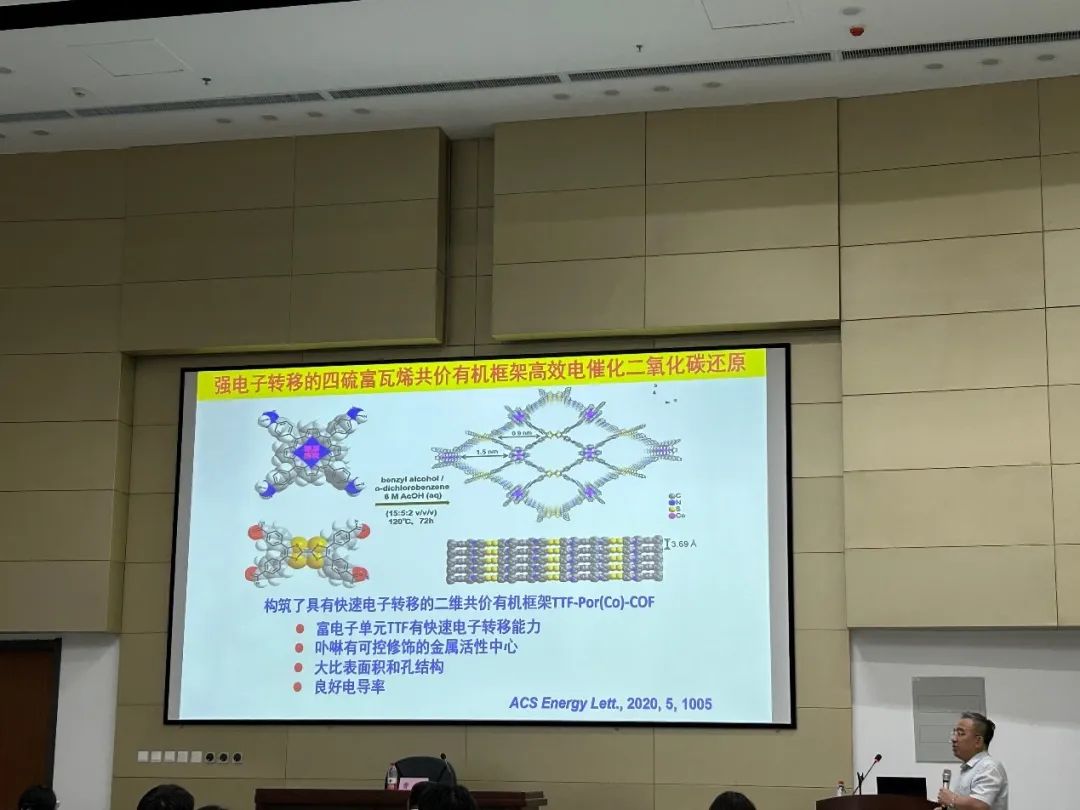 由于多孔框架材料比表面积大、吸附能力强、可富集CO2,又具有催化CO2转化活性的位点,在吸附富集CO2的同时实现催化转化,因此可被应用于催化二氧化碳转化领域。接着,曹老师介绍了多孔框架材料在CO2催化领域的三个方面的应用以及团队的一些工作:多孔框架材料催化二氧化碳环加成;多孔框架材料高效电催化二氧化碳还原;多孔框架材料光催化CO2还原,并详细介绍了一些用于CO2催化的多孔框架材料的设计合成,以及如何调控活性位点从而设计出高活性高稳定性的材料。