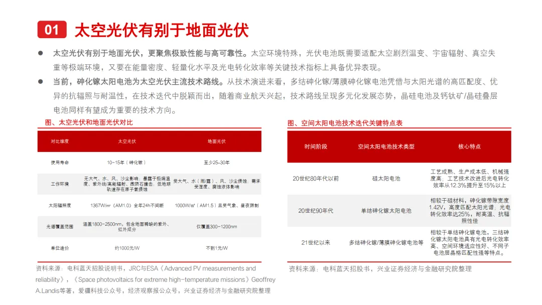 本篇行业报告可以通过扫下方知识星球下载。39元就可以下载星球所有报告。免费提供报告查找服务。随着商业航天的快速发展,太空光伏市场正逐渐成为光伏行业的新蓝海。太空光伏与传统地面光伏不同,它要求更高的性能和可靠性,以适应太空中的极端环境,如真空、剧烈的温度变化和宇宙辐射。这一领域的关键技术包括砷化镓太阳电池、晶硅电池、钙钛矿/晶硅叠层电池等。砷化镓太阳电池因其高效率和优秀的抗辐射能力,成为太空光伏的主流技术。然而,其高昂的成本和有限的资源储量限制了其规模化应用。晶硅电池虽然产业化基础扎实,但比功率偏低。钙钛矿电池以其高比功率和柔韧性,展现出成为下一代技术路线的潜力。光伏企业纷纷布局太空光伏领域,以抢占市场先机。钧达股份通过战略投资尚翼光电,进入太空光伏高价值赛道。尚翼光电依托中科院技术背景,专注于钙钛矿电池的太空光伏应用,拥有独家的太空仿真研发平台。东方日升和晶科能源也在积极布局下一代技术路线,如钙钛矿/晶硅异质结叠层电池技术。天合光能则在多个技术路线上进行全面布局,致力于成为太空光伏的领先者。随着全球低轨卫星星座竞赛的全面提速,太空光伏市场空间巨大。据预测,若发射4000颗卫星且单星太阳翼平均面积达100㎡,对应的市场规模约为800亿元。而随着太空数据中心的能源需求爆发式增长,市场空间有望达到数千亿甚至万亿级别。总之,太空光伏作为商业航天的新赛道,正吸引着越来越多的光伏企业投身其中。随着技术的进步和成本的降低,太空光伏有望在未来的航天领域发挥更加重要的作用。免责声明:以上分享报告为公开合法渠道获得,内容大部分来源于网络,版权归原作者所有,如有侵权,请及时与我们联系,我们将第一时间保障您的权益。推荐内容仅供参考学习,不构成投资建议。