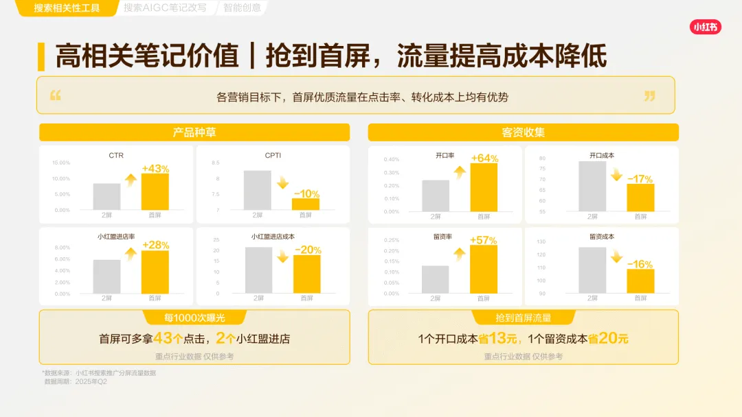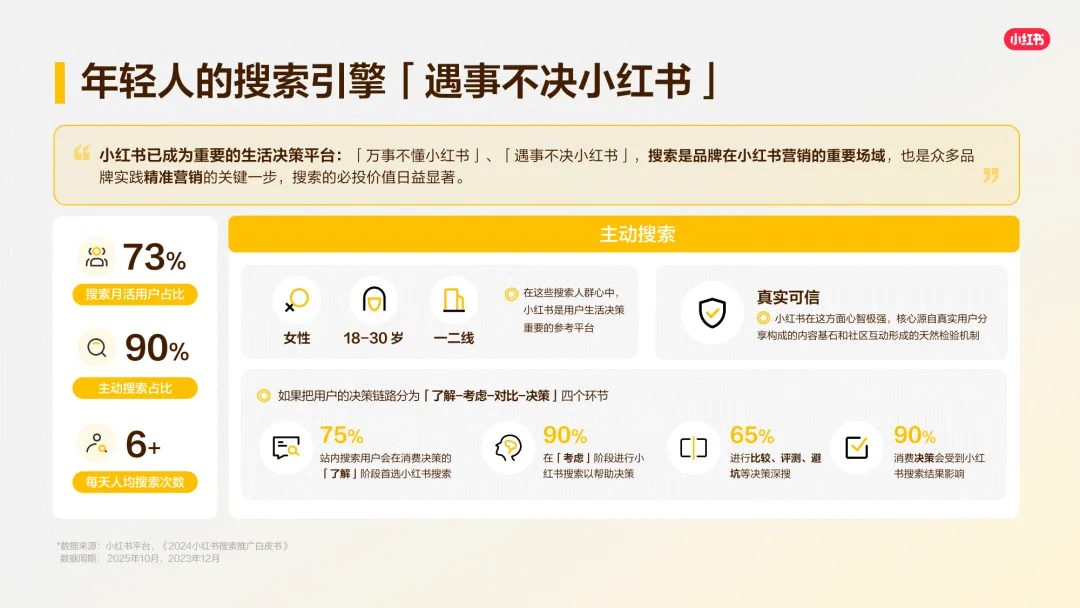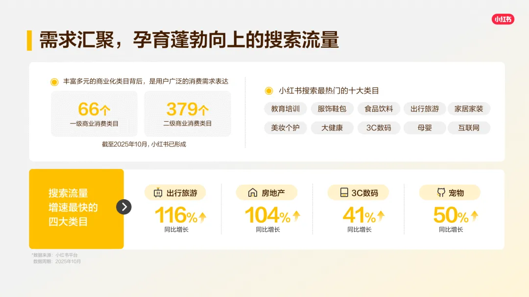 小红书已成为用户首选的生活决策平台,“遇事不决小红书” 的心智深入人心,73% 的月活用户会进行搜索,90% 的用户主动搜索占比,使其成为品牌精准营销的关键场域。平台涵盖 66 个一级商业消费类目、379 个二级类目,出行旅游、房地产等四大类目搜索流量同比增速显著,消费需求旺盛。