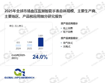据GIR (Global Info Research)调研,按收入计,2024年全球血压监测智能手表收入大约855百万美元,预计2031年达到3801百万美元,2025至2031期间,年复合增长率CAGR为24.0%。