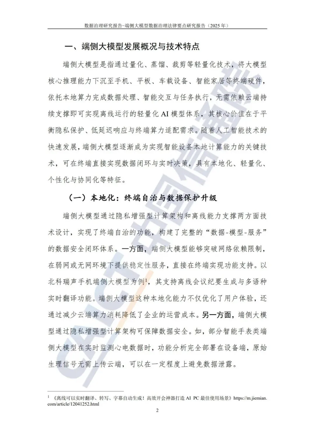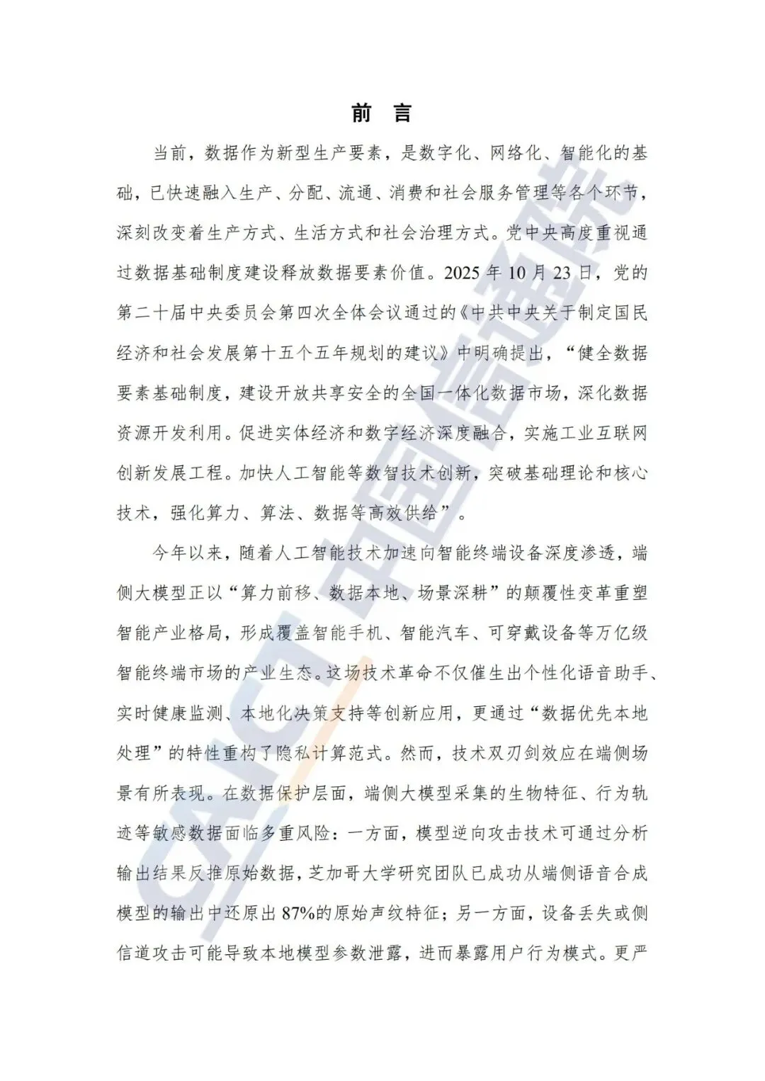 当前,数据作为新型生产要素,是数字化、网络化、智能化的基 础,已快速融入生产、分配、流通、消费和社会服务管理等各个环节, 深刻改变着生产方式、生活方式和社会治理方式。党中央高度重视通 过数据基础制度建设释放数据要素价值。2025 年 10 月 23 日,党的 第二十届中央委员会第四次全体会议通过的《中共中央关于制定国民 经济和社会发展第十五个五年规划的建议》中明确提出,“健全数据 要素基础制度,建设开放共享安全的全国一体化数据市场,深化数据 资源开发利用。促进实体经济和数字经济深度融合,实施工业互联网 创新发展工程。加快人工智能等数智技术创新,突破基础理论和核心 技术,强化算力、算法、数据等高效供给”。 今年以来,随着人工智能技术加速向智能终端设备深度渗透,端 侧大模型正以“算力前移、数据本地、场景深耕”的颠覆性变革重塑 智能产业格局,形成覆盖智能手机、智能汽车、可穿戴设备等万亿级 智能终端市场的产业生态。这场技术革命不仅催生出个性化语音助手、 实时健康监测、本地化决策支持等创新应用,更通过“数据优先本地 处理”的特性重构了隐私计算范式。然而,技术双刃剑效应在端侧场 景有所表现。在数据保护层面,端侧大模型采集的生物特征、行为轨 迹等敏感数据面临多重风险:一方面,模型逆向攻击技术可通过分析 输出结果反推原始数据,芝加哥大学研究团队已成功从端侧语音合成 模型的输出中还原出 87%的原始声纹特征;另一方面,设备丢失或侧 信道攻击可能导致本地模型参数泄露,进而暴露用户行为模式。更严峻的是,端侧大模型降低了虚假信息生成的技术门槛,攻击者仅需单 台终端即可伪造逼真的深度伪造内容。 自 2020 年起,中国信通院互联网法律研究中心已持续发布五本 数据治理领域的研究报告,形成系列化成果。值此之际,该中心紧密 结合端侧大模型技术的前沿进展与应用实践,精心编纂了第六本数据 治理专题报告——《数据治理研究报告-端侧大模型数据治理法律要 点研究(2025 年)》。本报告立足部署在智能终端设备上的大模型 所具有的独特技术架构与运行机理,系统剖析其在数据采集、存储、 处理、传输及销毁等全生命周期环节中潜藏的风险特性,通过全面梳 理国内外相关立法动态与实践经验,创新性地提出了一套兼具前瞻性 与实操性的综合治理策略,旨在为打造安全可靠、合规有序的端侧智 能生态环境提供有力的理论支撑与实践指引。端侧大模型是指通过量化、蒸馏、裁剪等轻量化技术,将大模型 核心推理能力下沉至手机、平板、车载设备、智能家居等终端硬件, 依托本地算力完成数据处理、智能交互与任务执行,无需依赖云端持 续支撑即可实现离线运行的轻量化 AI 模型体系,其核心价值在于平 衡隐私保护、低延迟响应与终端算力适配需求。随着人工智能技术的 快速发展,端侧大模型逐渐成为实现智能设备本地计算能力的关键技 术,可在终端直接实现数据闭环与实时决策,具有本地化、轻量化、 个性化与协同化等特征。