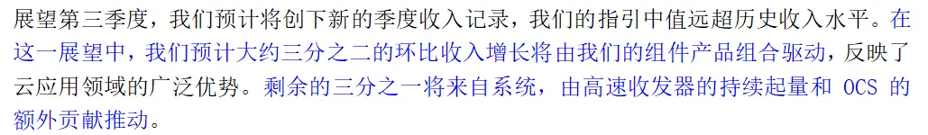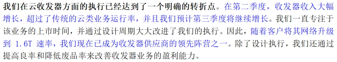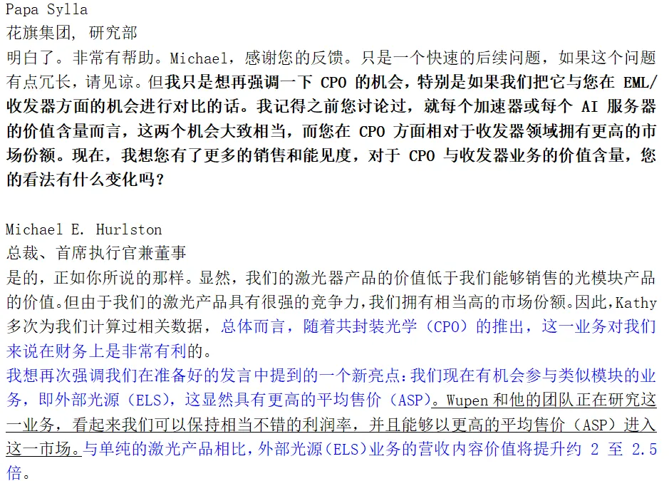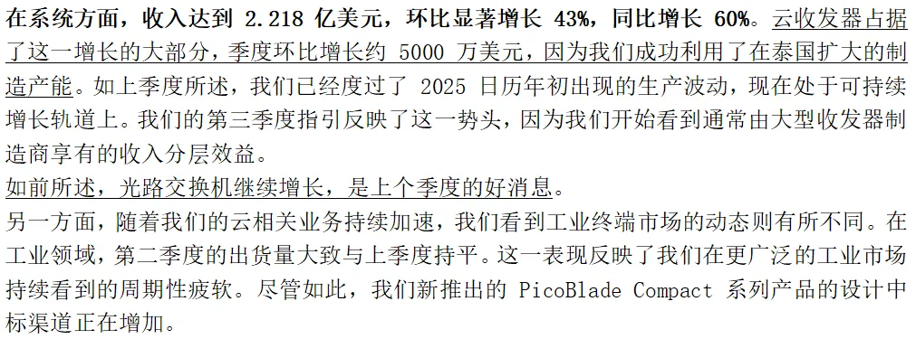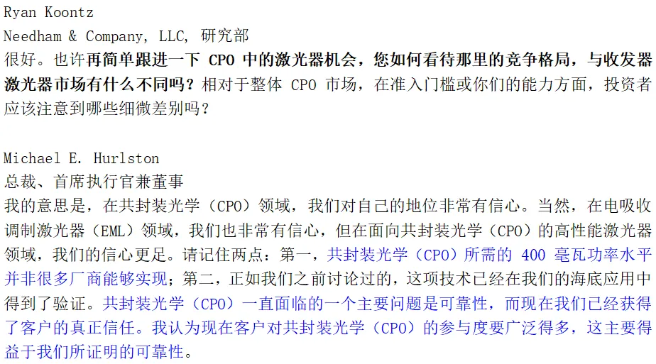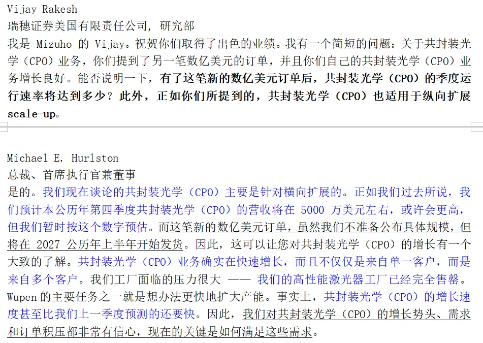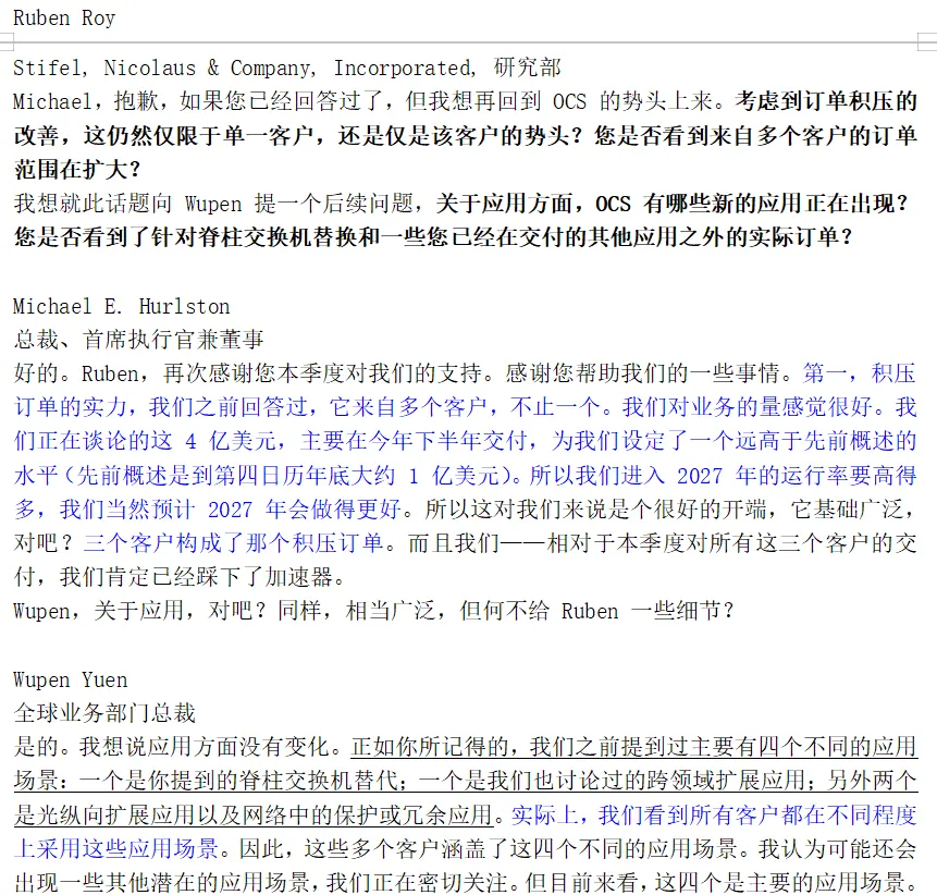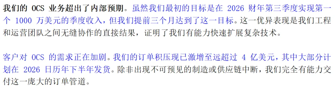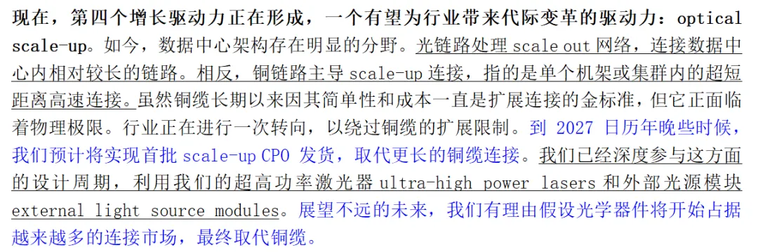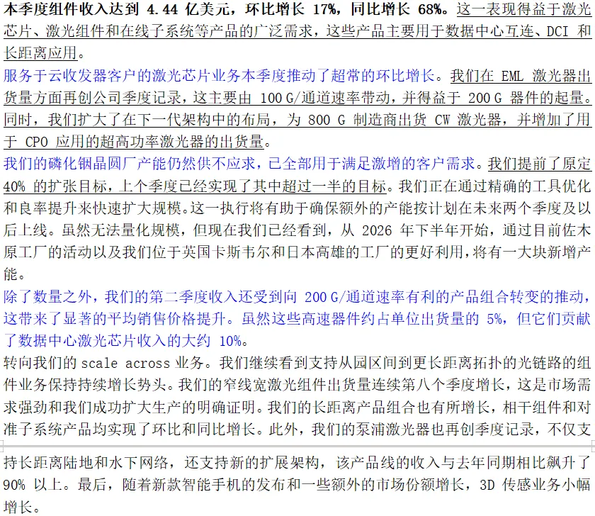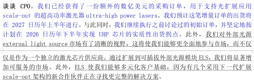 这里的意思是用于scale out的CPO的激光器业务下半年将迎来出货拐点,Q4预计有5000w美元收入,并且本季度新获得的增量订单将在2027年上半年发货(数亿美元换算一下,如果按照CPO交换机的ELS价值量0.72w美元/其中的CW激光器0.43w美元,那么2w-4w-6w-8w-10w出货量分别对应ELS价值量1.44亿美元-2.88亿美元-4.32亿美元-5.76亿美元-7.2亿美元 or CW激光器 0.86亿美元-1.72亿美元-2.58亿美元-3.44亿美元-4.3亿美元)